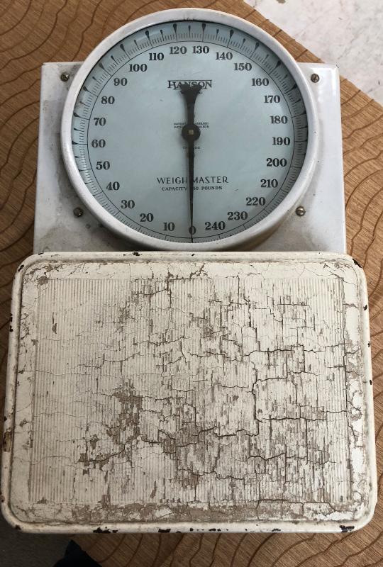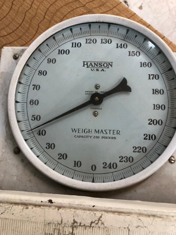 Vintage scale Hanson Weighmaster seems to work fine, weighs up to 250 pounds. Scale was sold at a prior auction and not paid for.