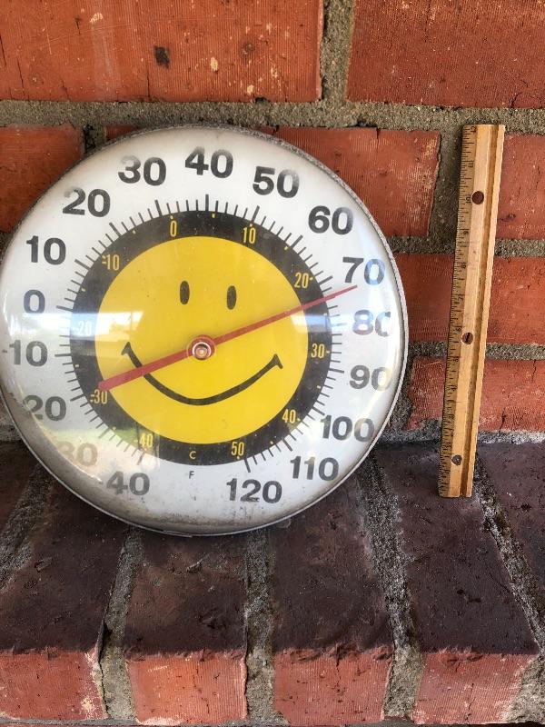 Vintage patio thermometer. Bright yellow happy face center. Good outdoor condition.