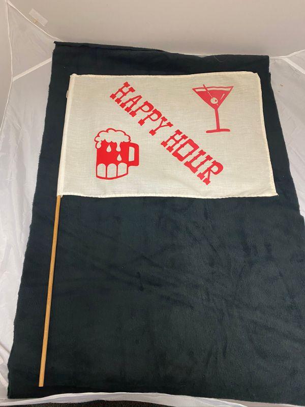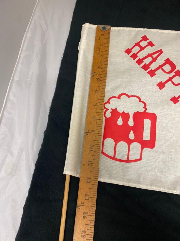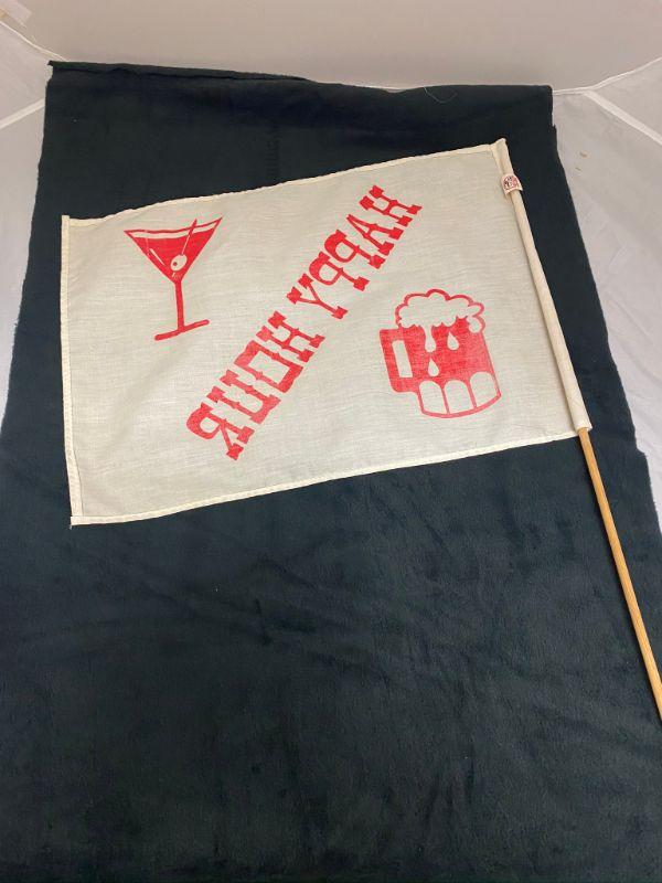 Vintage Happy Hour Bar Flag. White flag with red lettering. Exact age unknown. flag is over 12" wide.