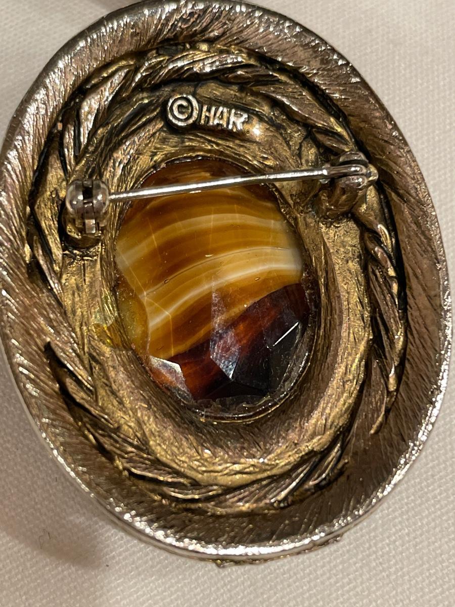 Har brooch with green and brown stones accenting multicolor center