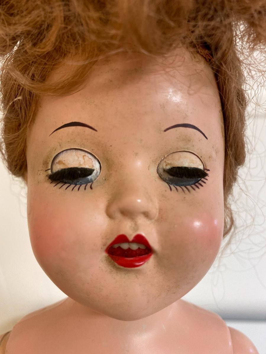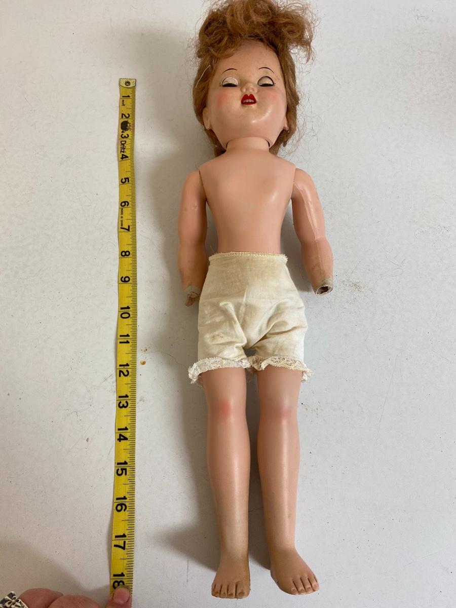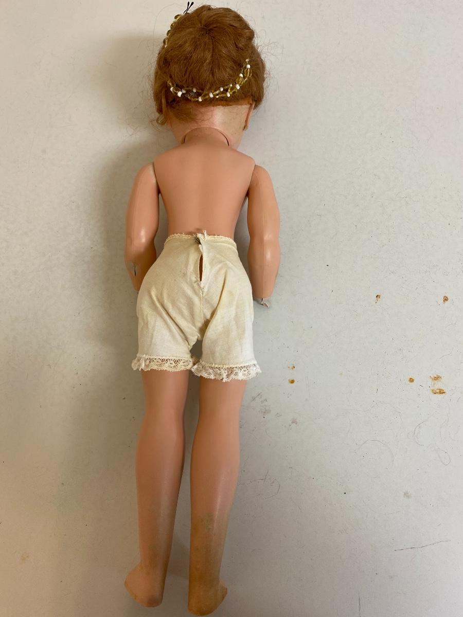 Vintage hard plastic doll, 17 inchs tall with lace knickers.