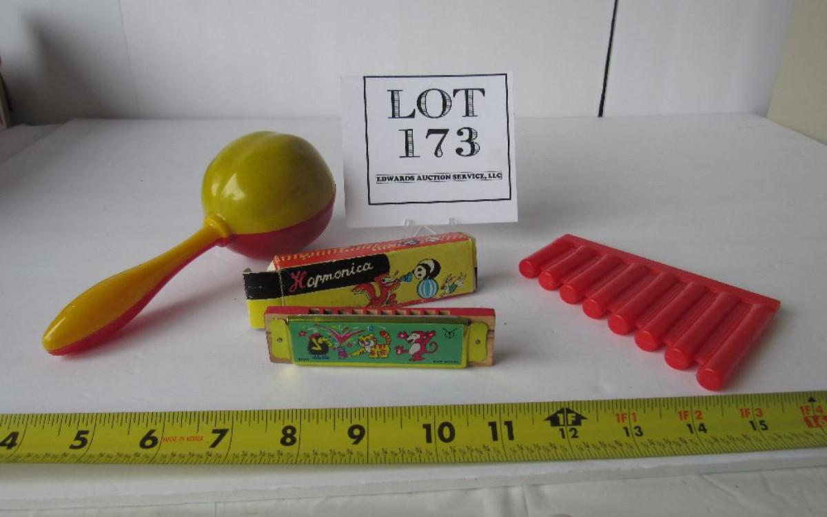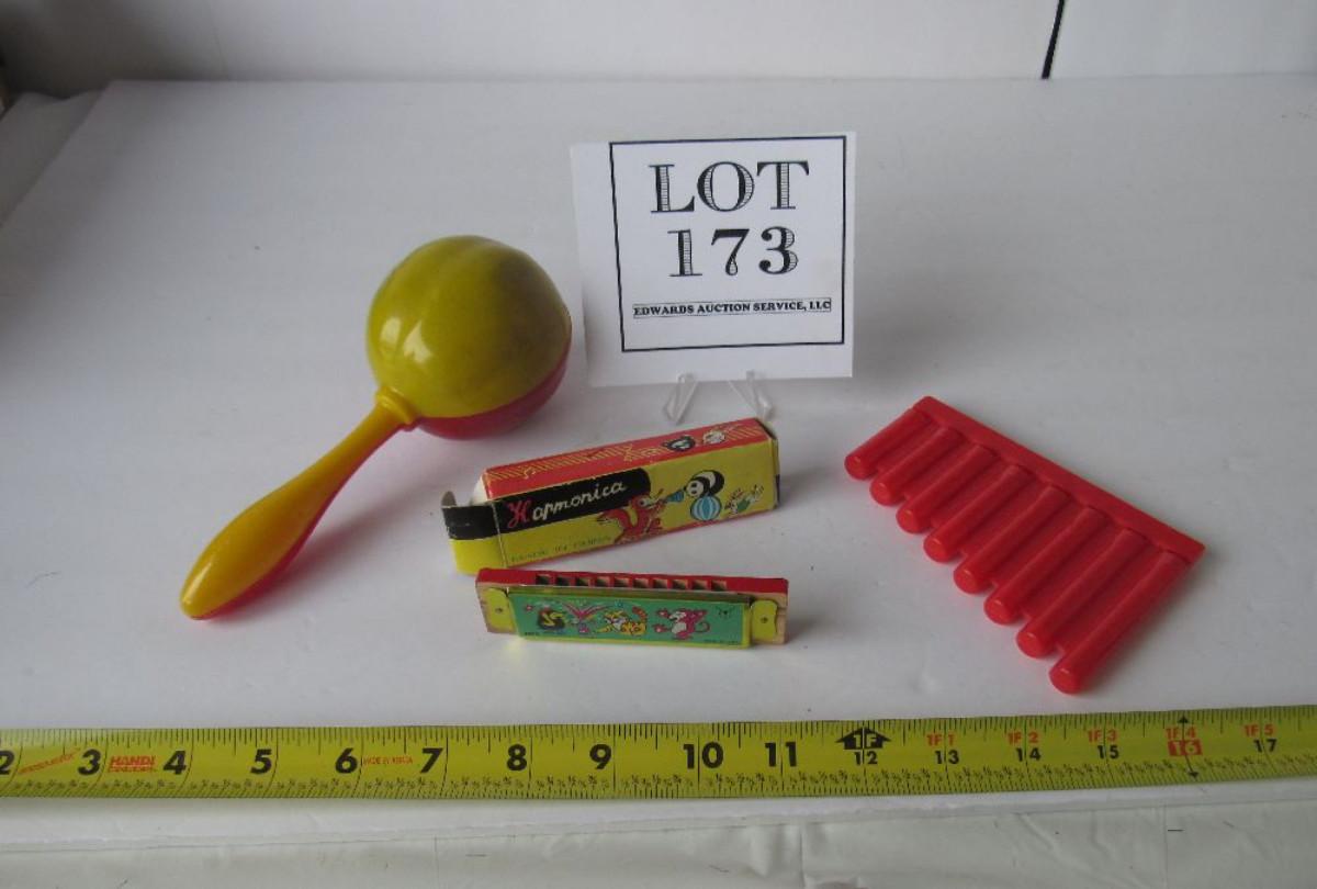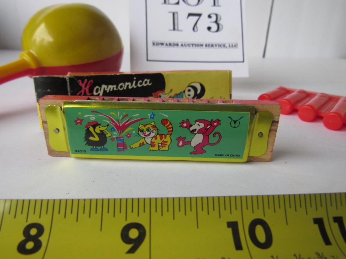 Vintage Hard Plastic Noisemakers and Metal Harmonica