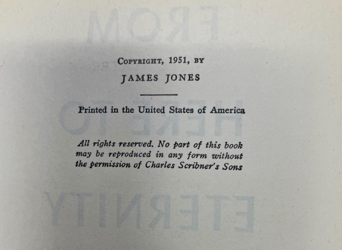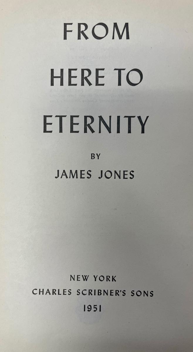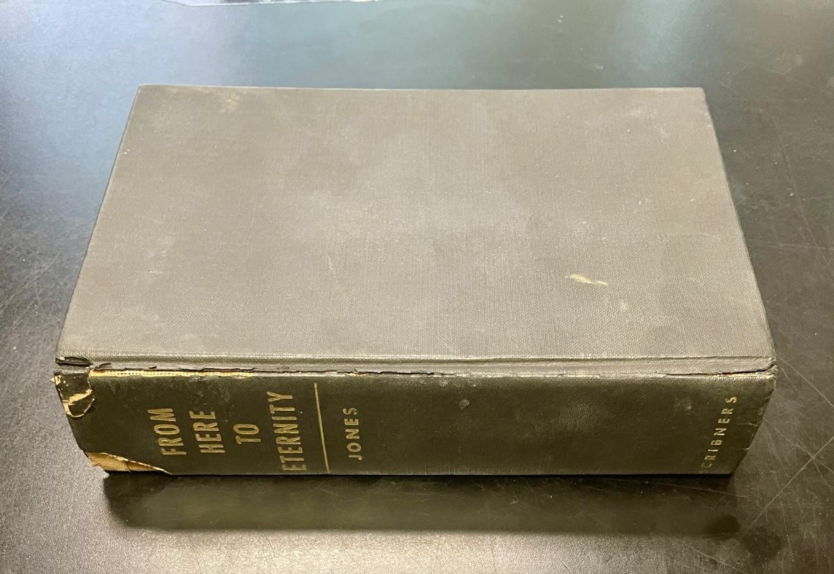 Original printing from 1951. By James Jones, book pages are in good shape, not much yellowing. Cover has some damage at the top of the spine and along the spine, see photos. 1954 movie version won Oscars for Best Picture, Best Actress (Donna Reed), and Best Supporting Actor (Frank Sinatra).