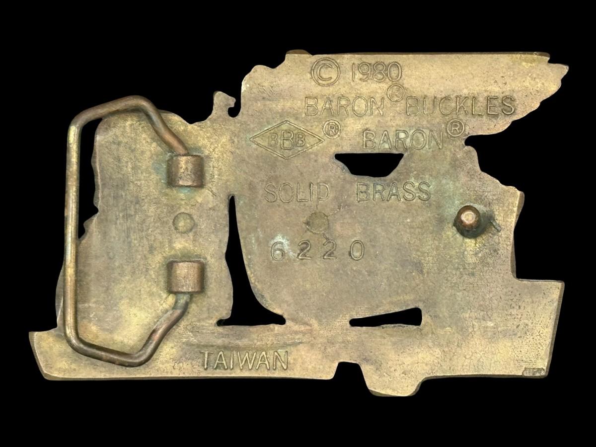 Dated 1980, by Baron Belt Buckles. Solid brass construction. Measurement: 4”L x 2.5”W. Pre-auction estimate: $50-$75. [KD]