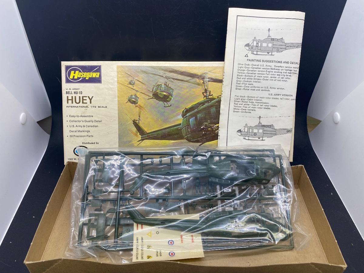 Vintage Bell HU-1D Huey helicopter scale model kit from Hasegawa. Vintage kit, looks complete, pieces have not been pulled apart yet, sticker sheet is still in package. Has instruction sheet included.