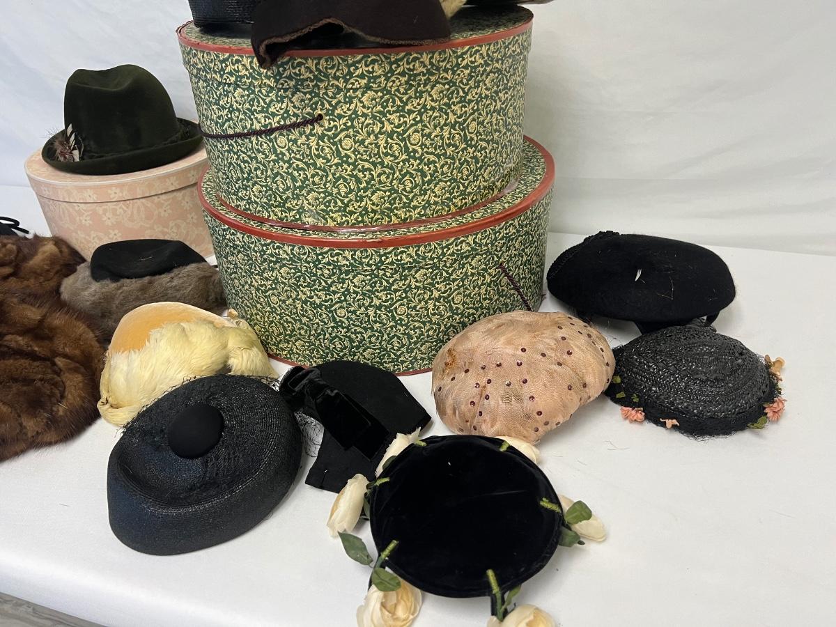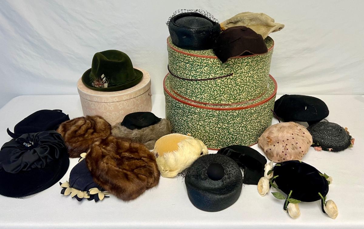 Includes ladies' hats, fascinators, and a men's fedora. Total of 17 pieces. Also includes three hat boxes. Age related wear. [SG]