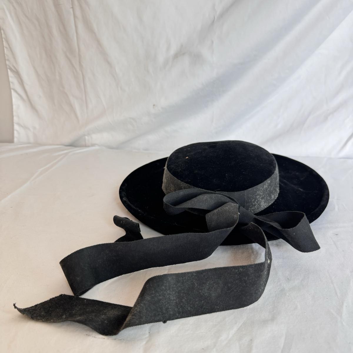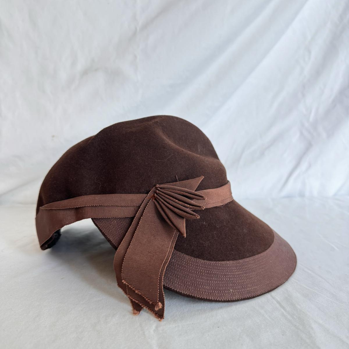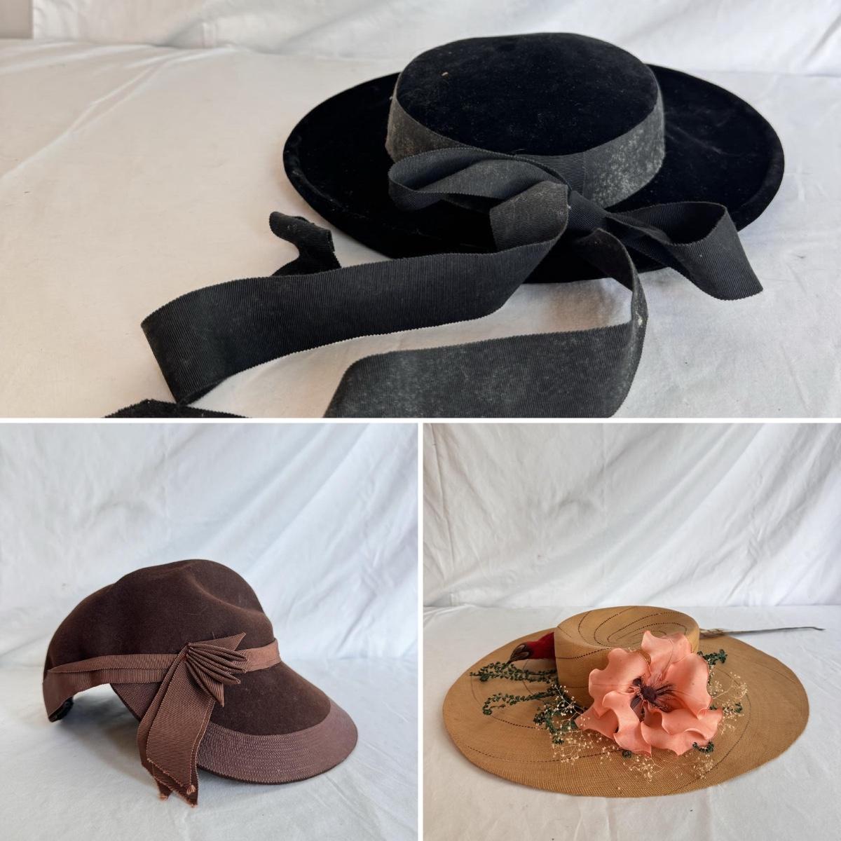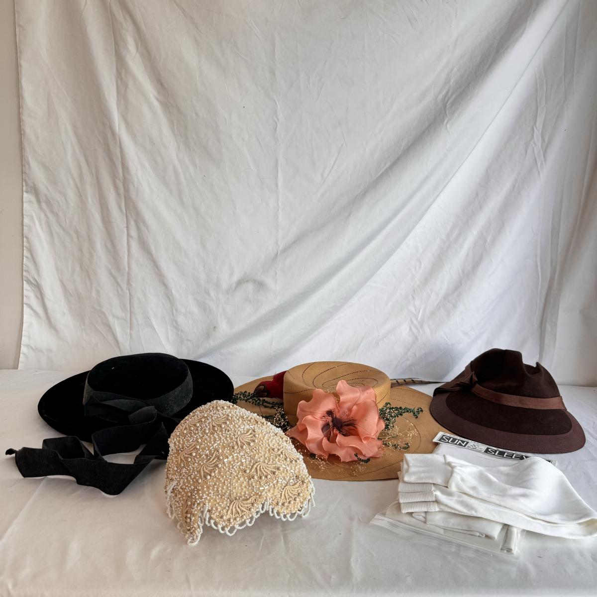 This lot includes one pair of Sun Sleeves, one flapper cap with “Individually fashioned for Purcells” on its tag, one Peck & Peck hat from Fifth Avenue, NY, one brown Dosnik’s Winston Salem hat, and one woven hat with flower and bird details. The largest hat is the first one individually pictured. It measures 16” x 3”H.