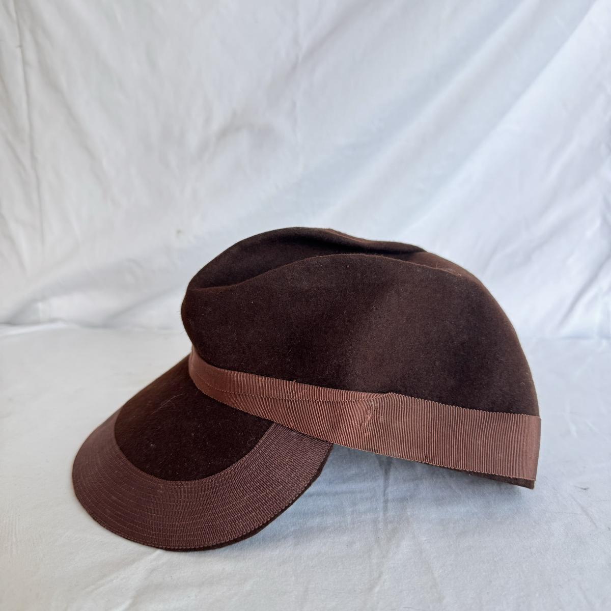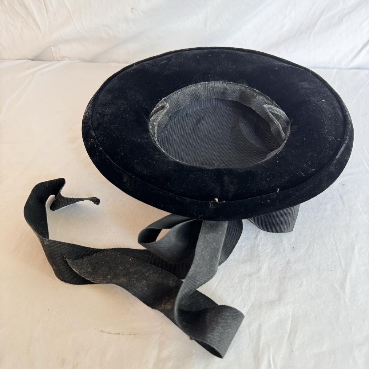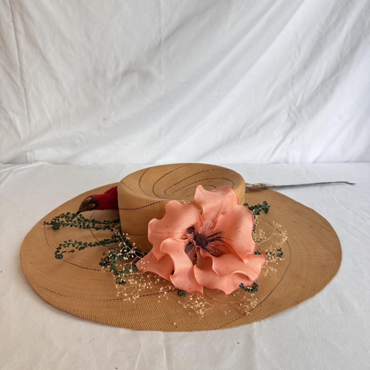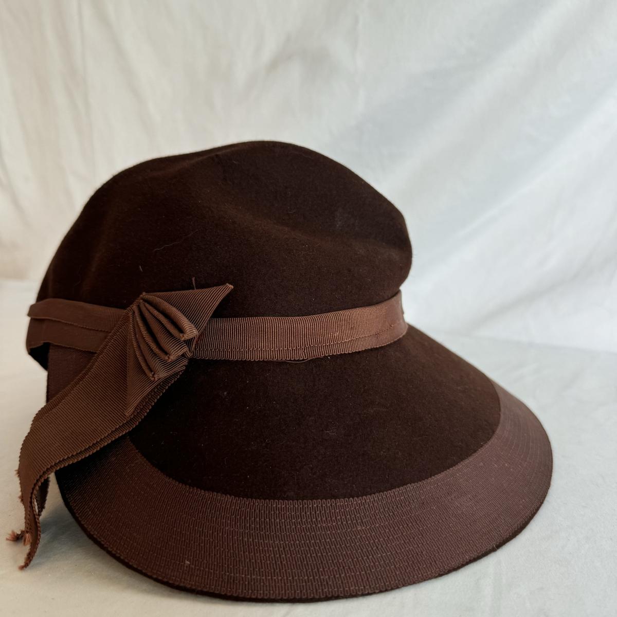 This lot includes one pair of Sun Sleeves, one flapper cap with “Individually fashioned for Purcells” on its tag, one Peck & Peck hat from Fifth Avenue, NY, one brown Dosnik’s Winston Salem hat, and one woven hat with flower and bird details. The largest hat is the first one individually pictured. It measures 16” x 3”H.
