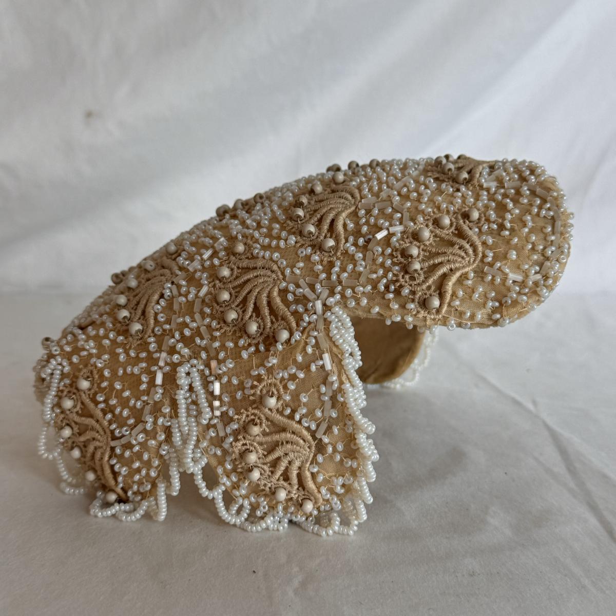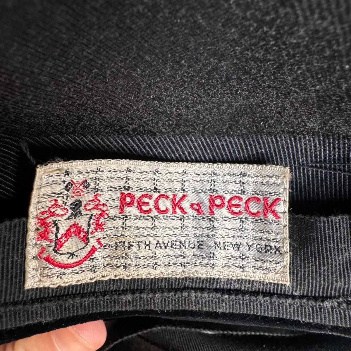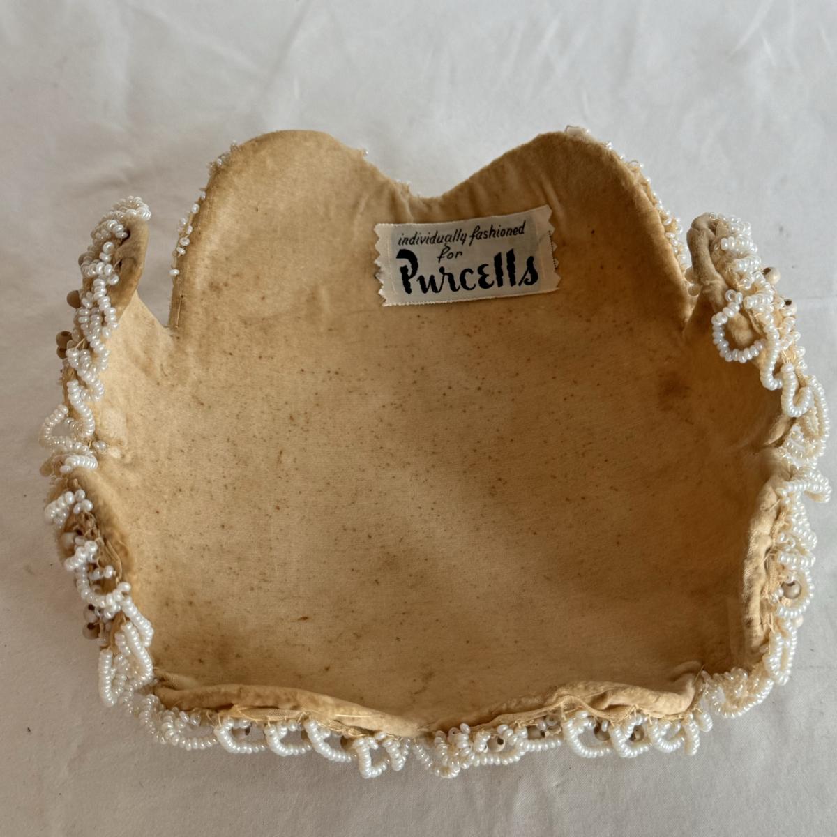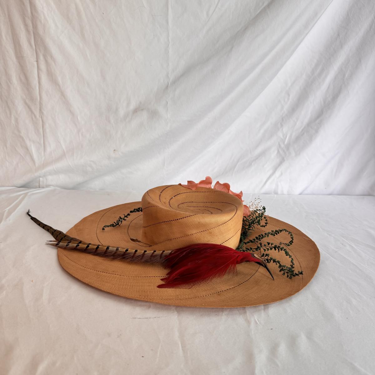 This lot includes one pair of Sun Sleeves, one flapper cap with “Individually fashioned for Purcells” on its tag, one Peck & Peck hat from Fifth Avenue, NY, one brown Dosnik’s Winston Salem hat, and one woven hat with flower and bird details. The largest hat is the first one individually pictured. It measures 16” x 3”H.
