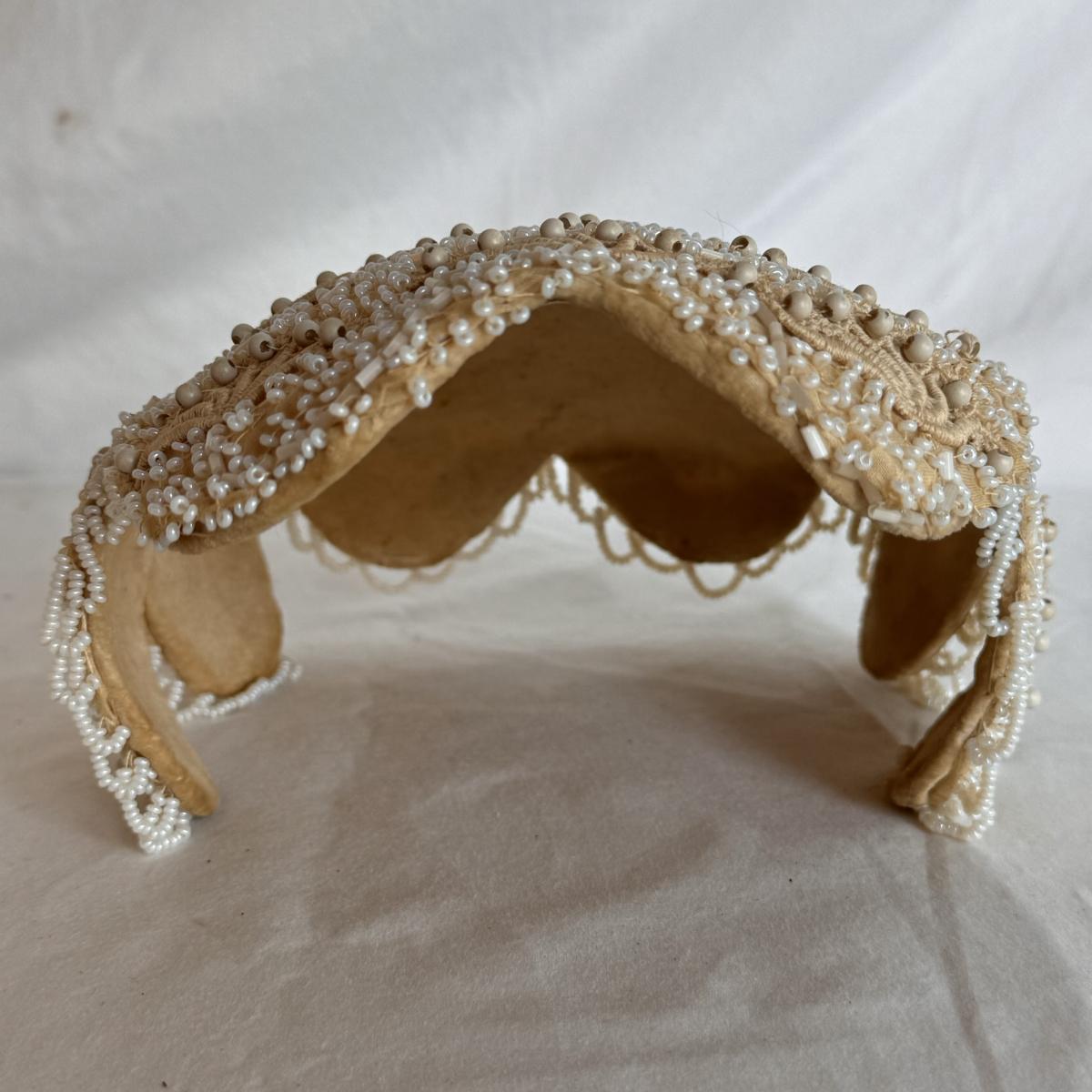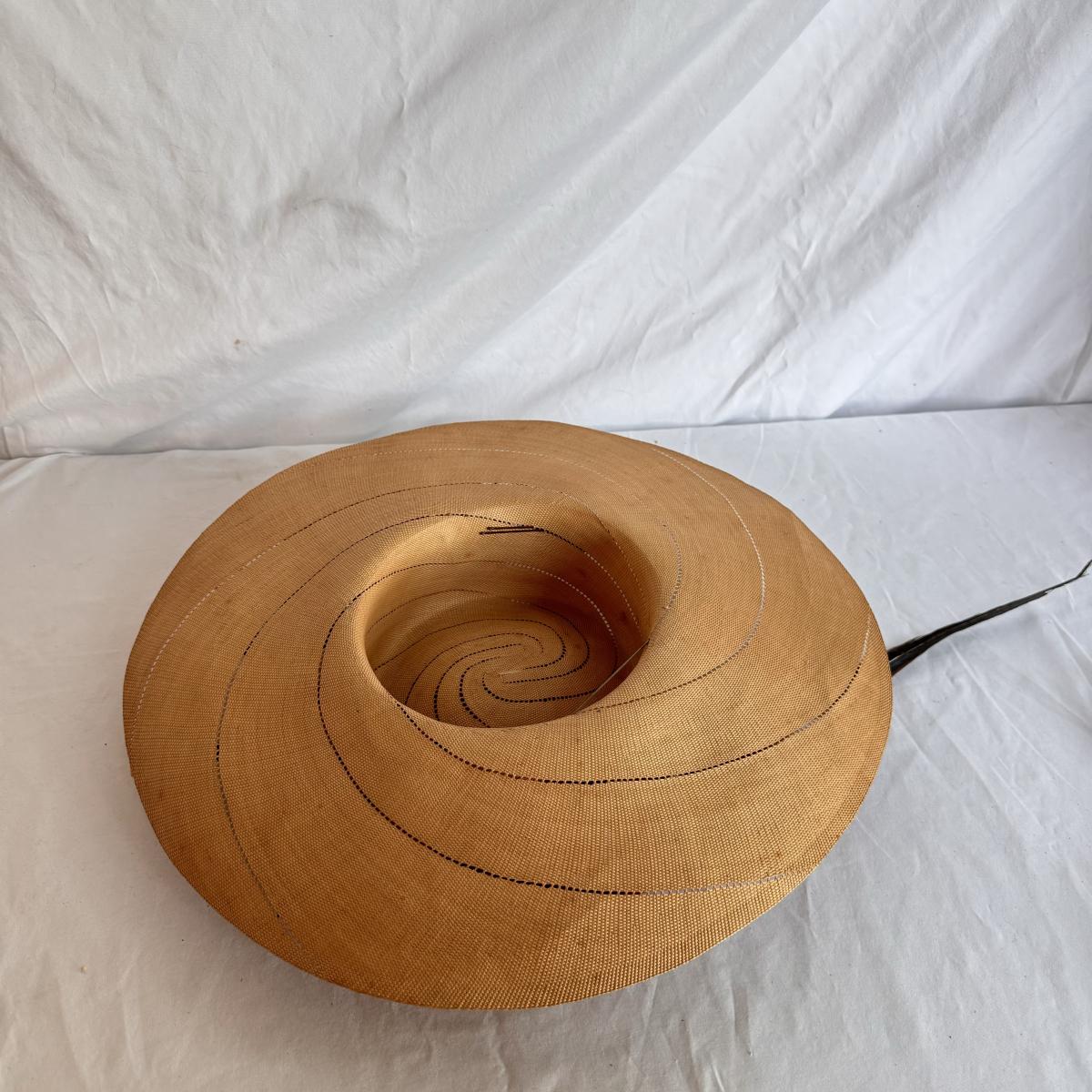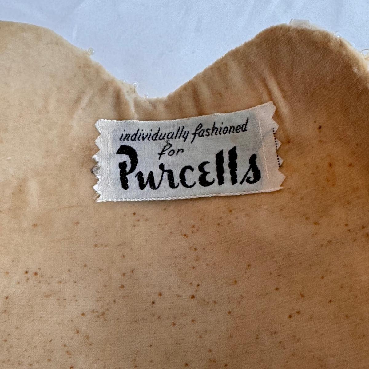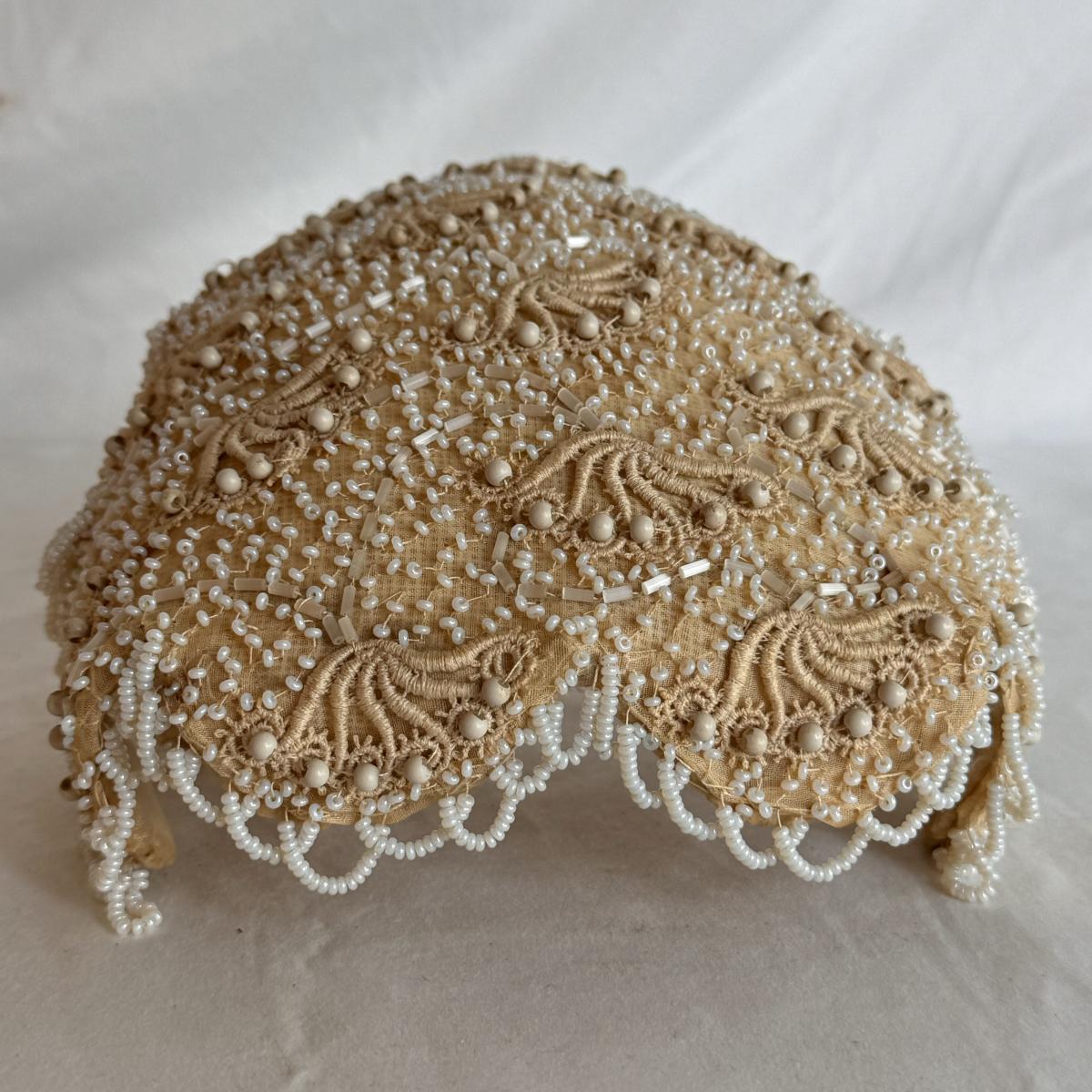 This lot includes one pair of Sun Sleeves, one flapper cap with “Individually fashioned for Purcells” on its tag, one Peck & Peck hat from Fifth Avenue, NY, one brown Dosnik’s Winston Salem hat, and one woven hat with flower and bird details. The largest hat is the first one individually pictured. It measures 16” x 3”H.