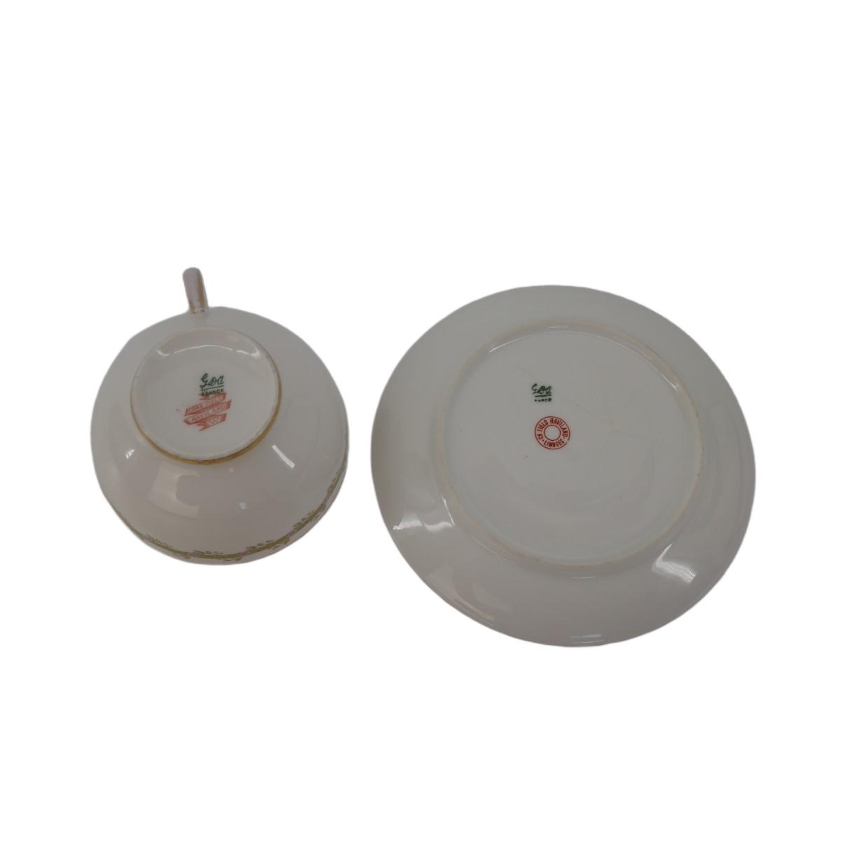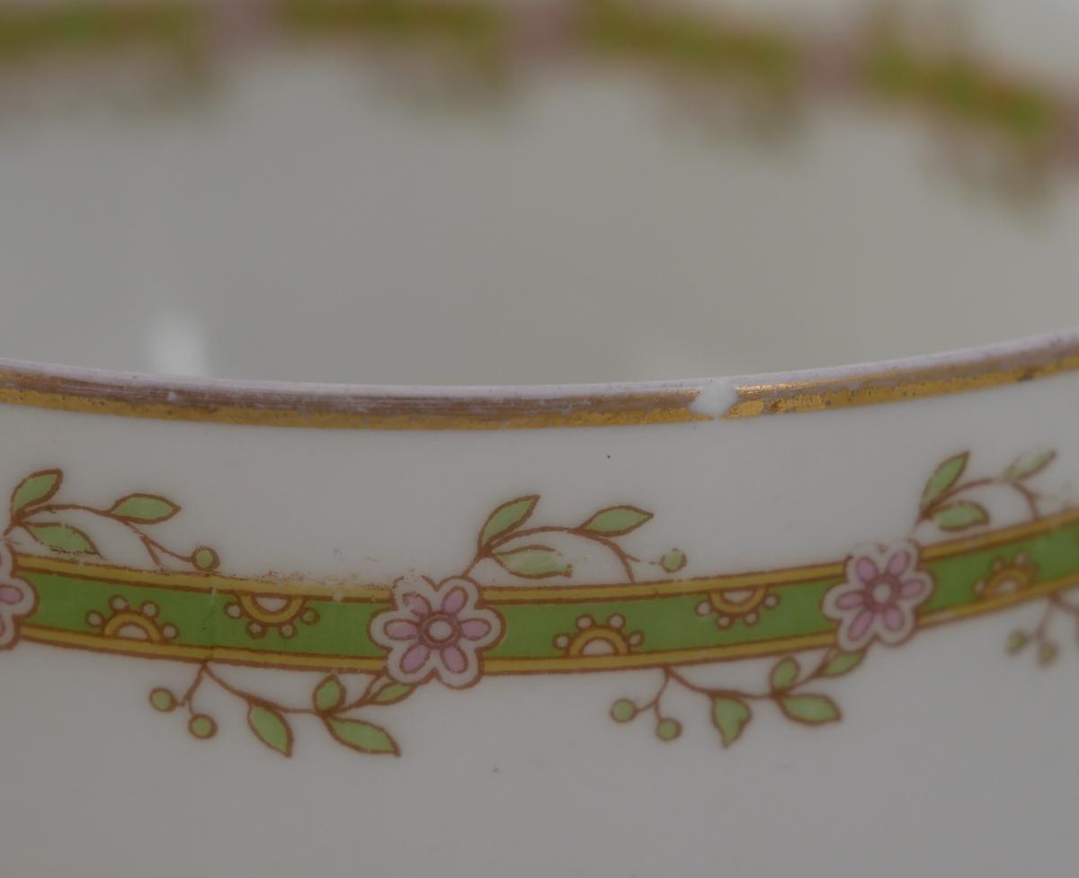 Vintage c. early 1900s GOA Chas Field Haviland Limoges France teacup and saucer. Beautiful green band and pink flower design. Wear to some paint and small chip on rim of cup. Saucer also has hairline crack that seems to have been repaired as you can't feel it. Please see all photos of this very cute set. Overall good condition! Teacup diameter measures 3.5" with a height of 2". Saucer diameter is 5.5". Lot weighs 6.2 oz. (G19)