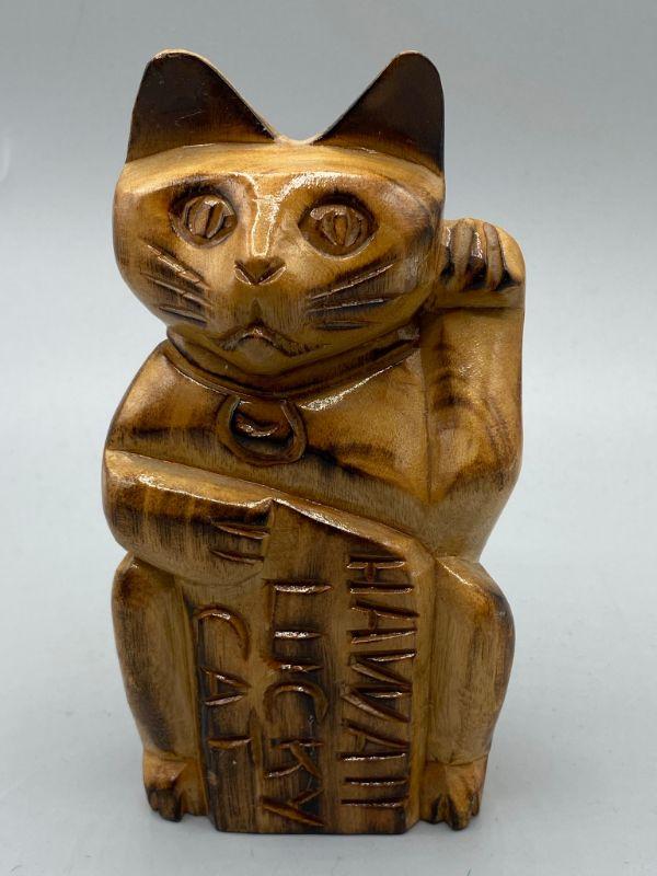 Vintage Hawaii souvenir. Carved wood Lucky Cat. Stands 6". Good condition.
