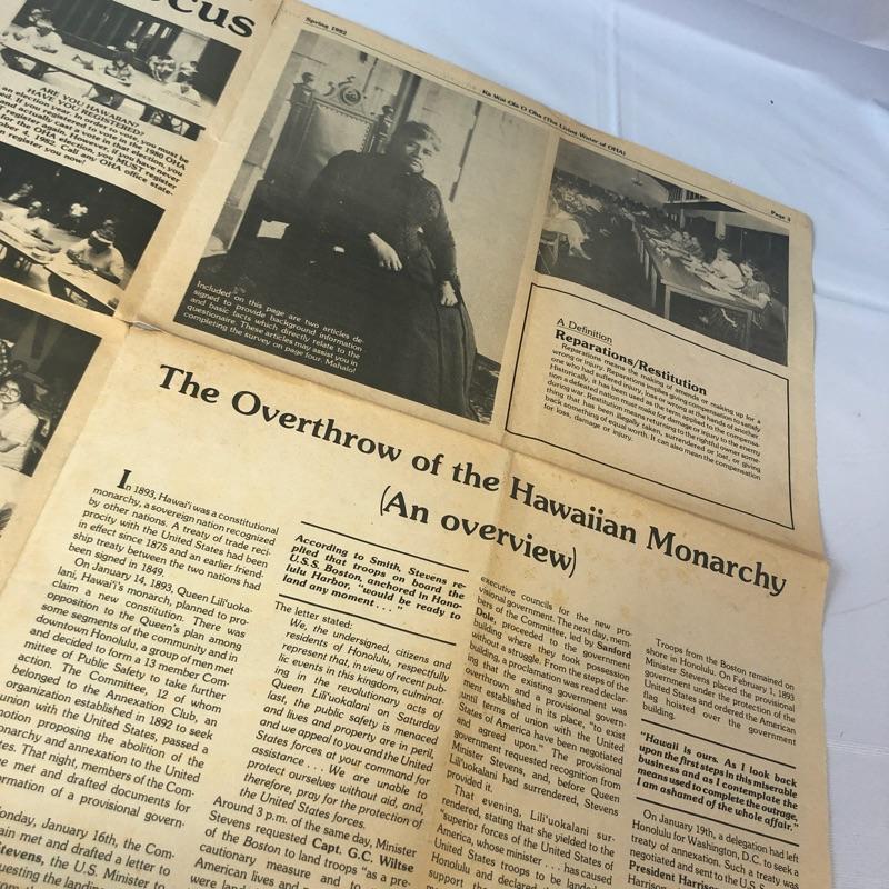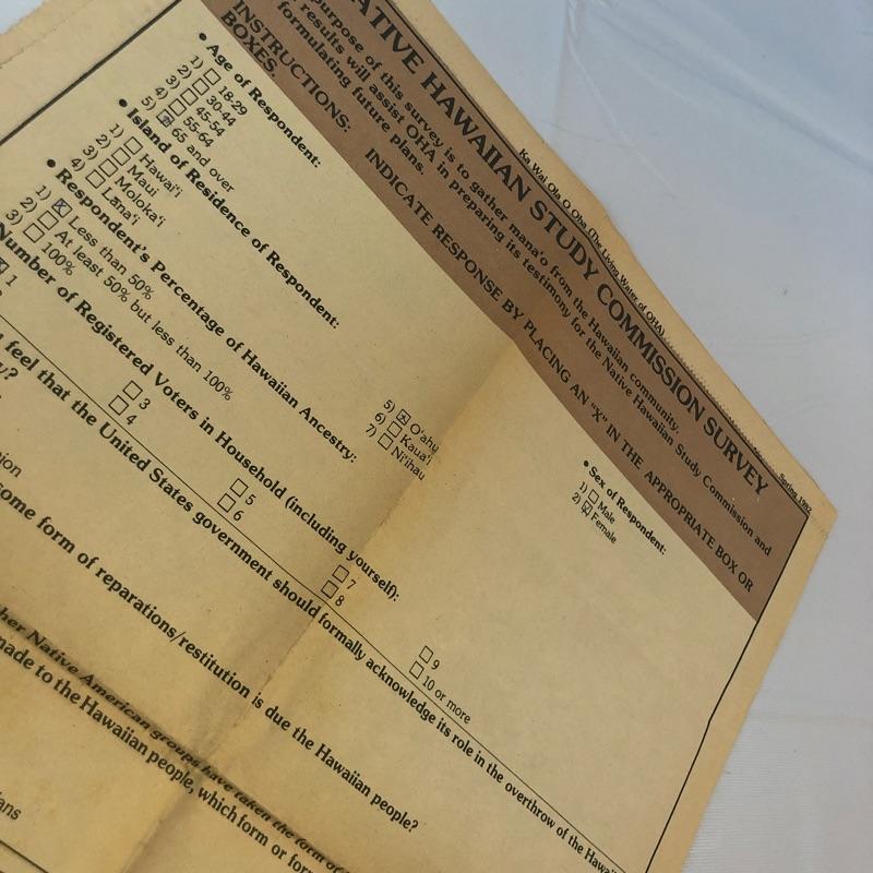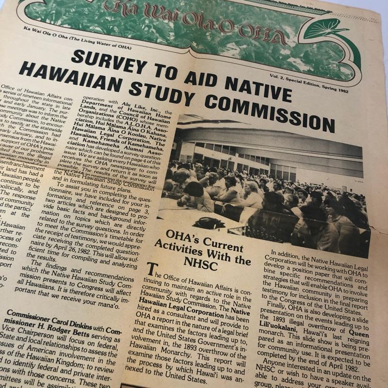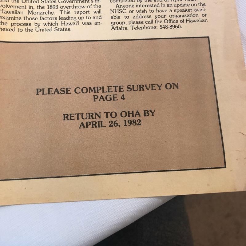 Spring 1982 Special Ed. of Ka Wai Ola O OHA by the Office of Hawaiian Affairs which includes the Native Hawaiian Study Commission Survey, focusing on reparations for native Hawaiians. The survey has been filled out by the subscriber whose address label appears on the back.