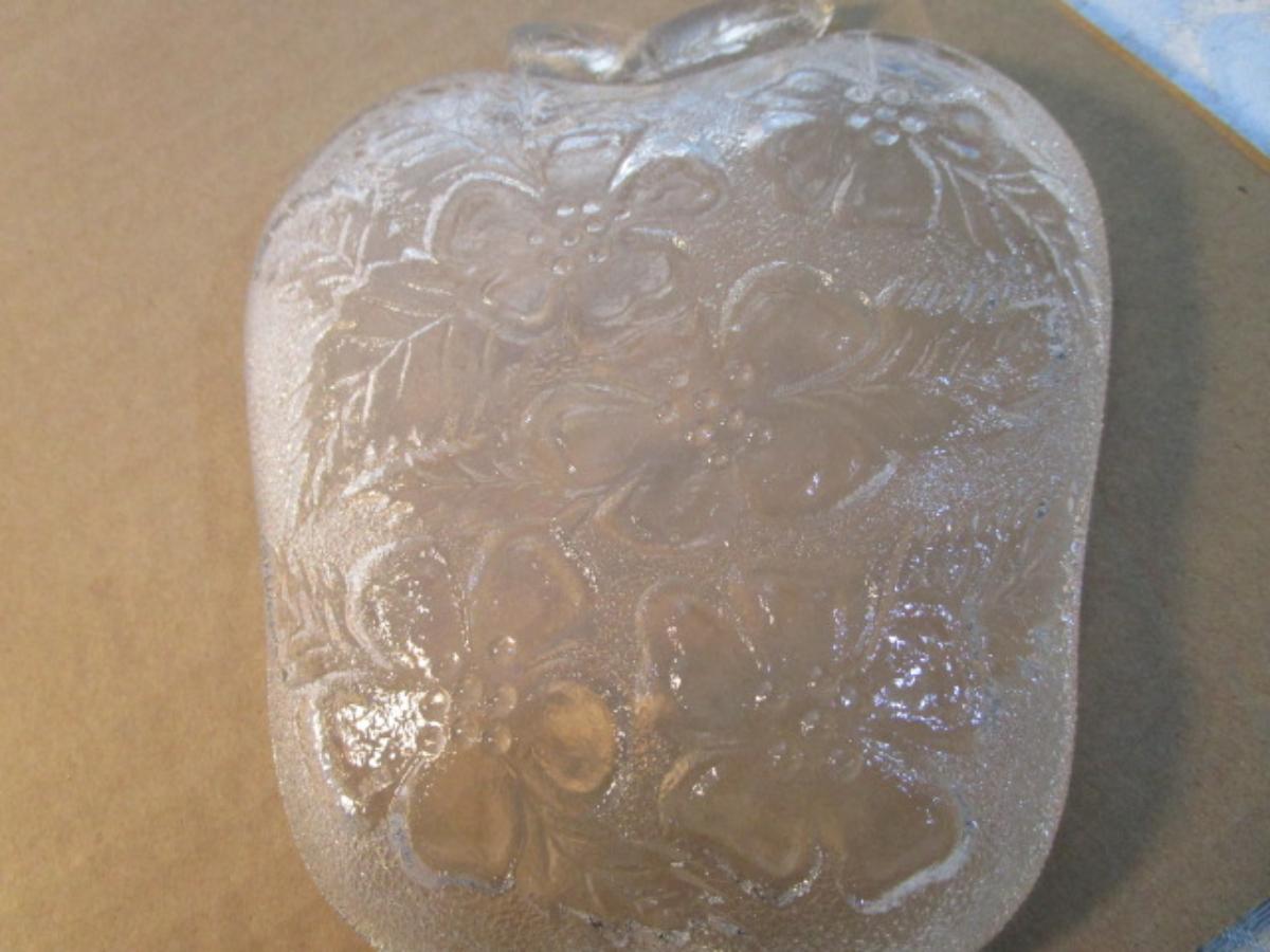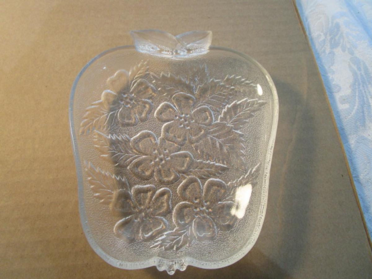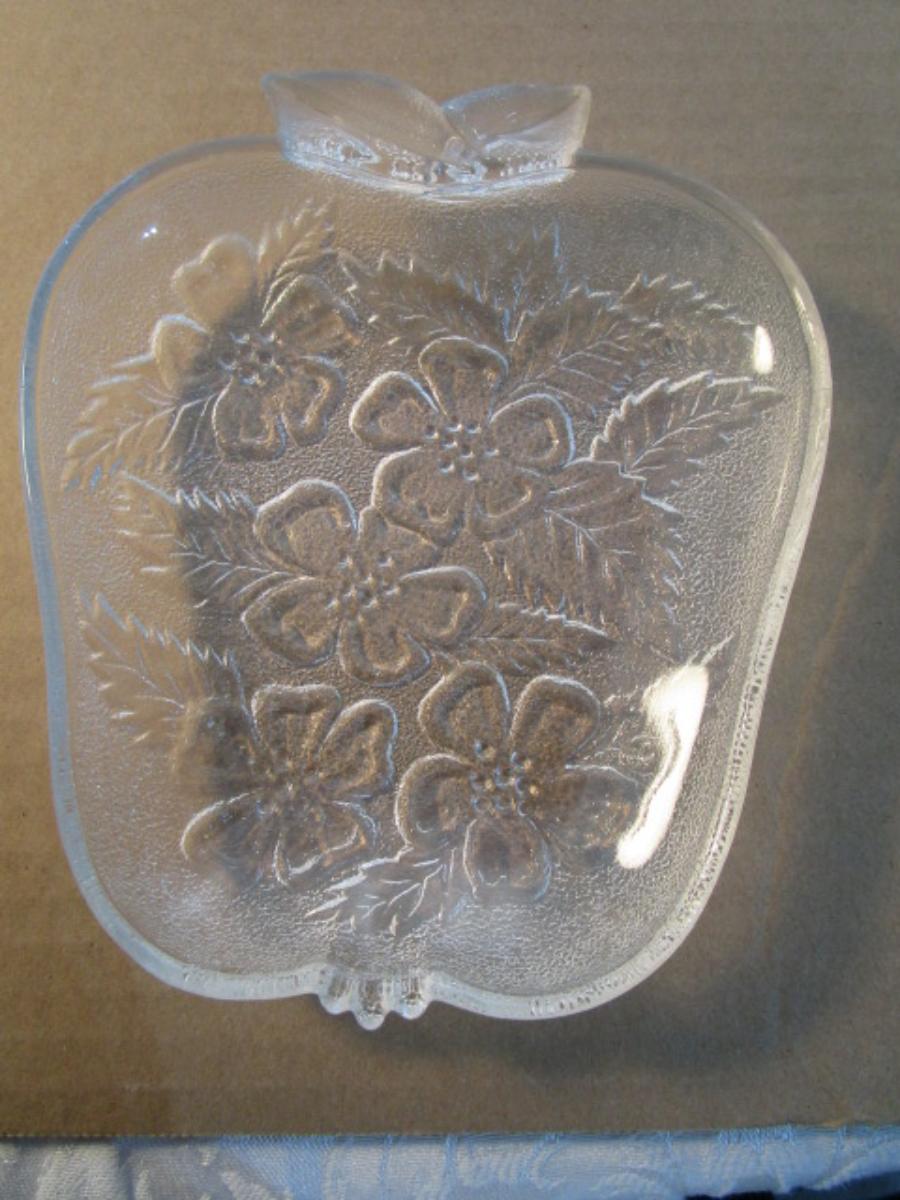 Vintage Hazel Atlas clear glass apple-shaped dish, Apple Blossom motif