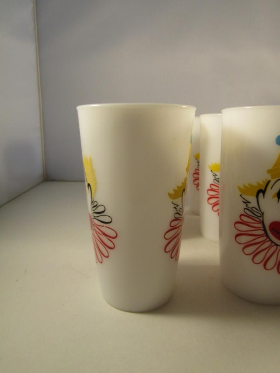 Vintage Hazel Atlas Drinking Glasses- Milk Glass with Painted Clowns- 4 Pieces