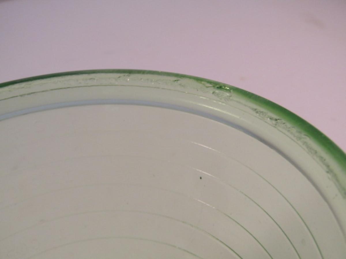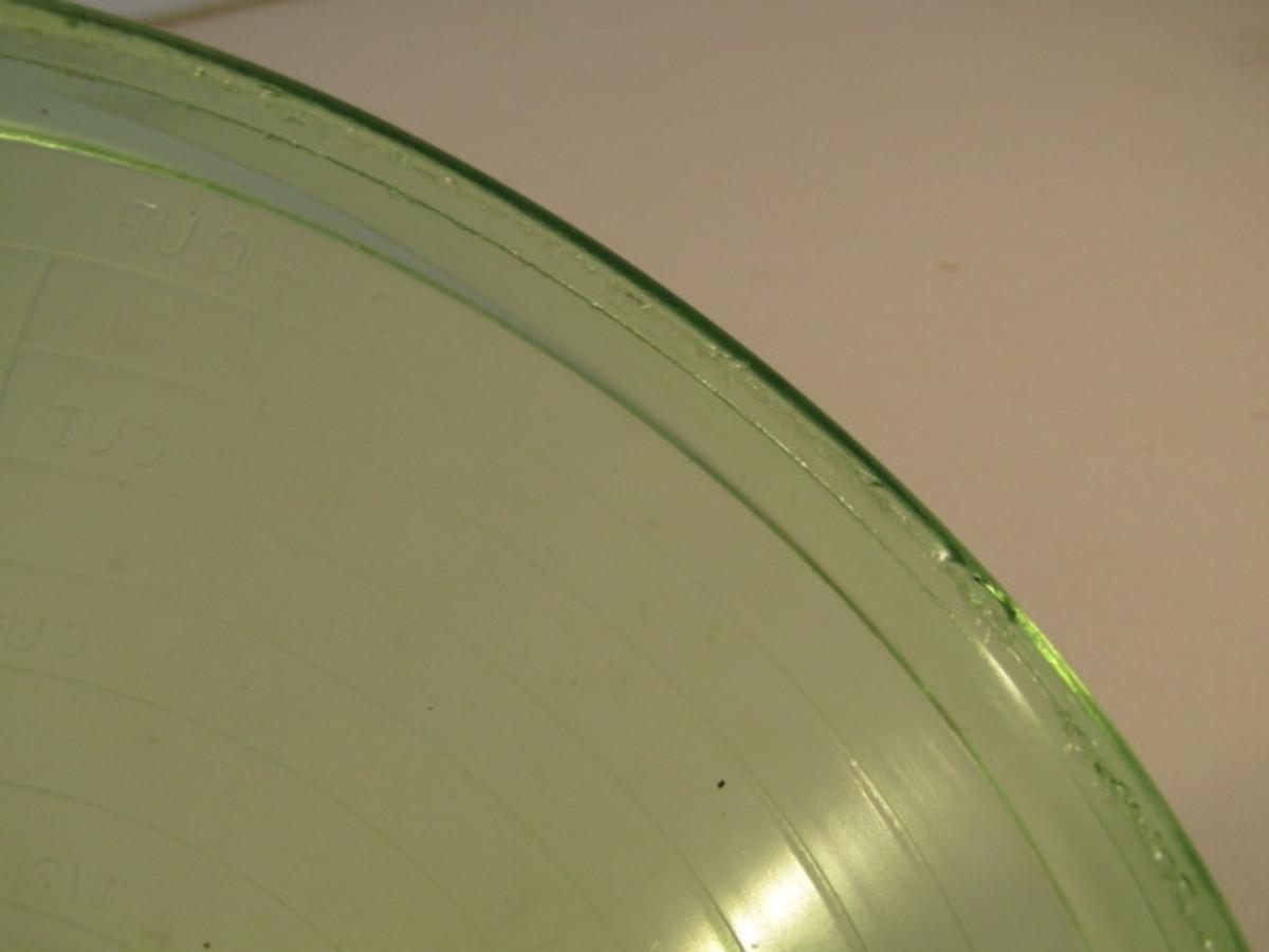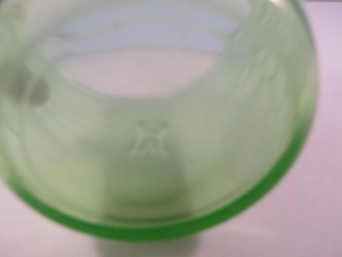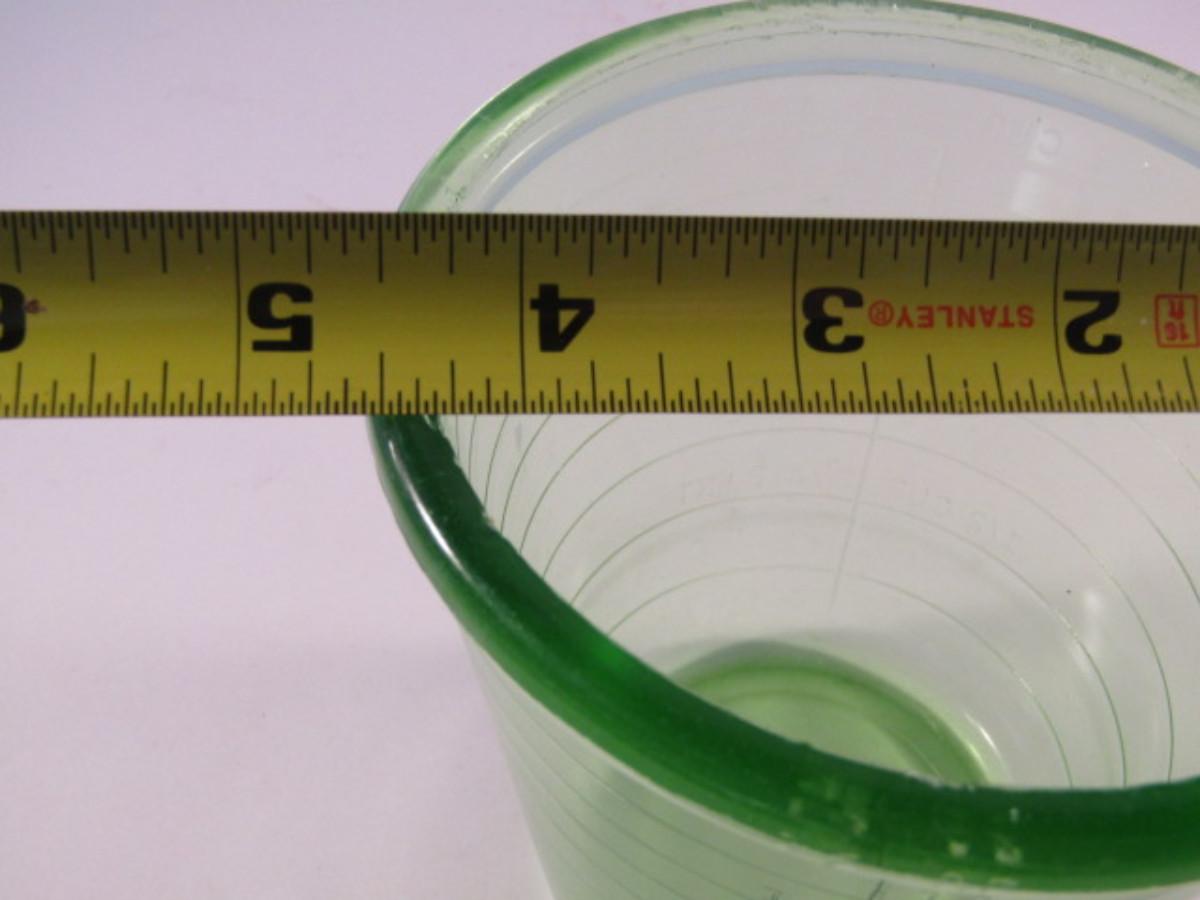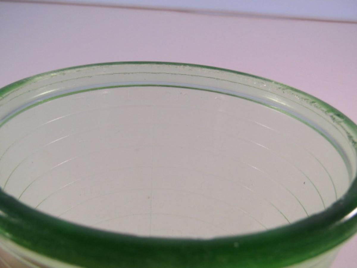 Vintage Hazel Atlas Uranium Glass 16 oz Measuring Cup- Approx 4 1/2" Tall, 4 1/2" in Diameter. Please see all pictures- small chip on rim.
