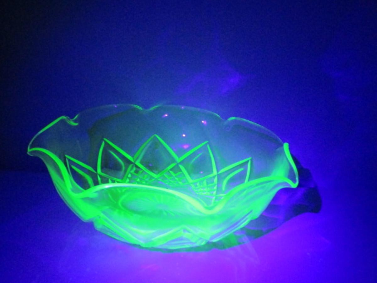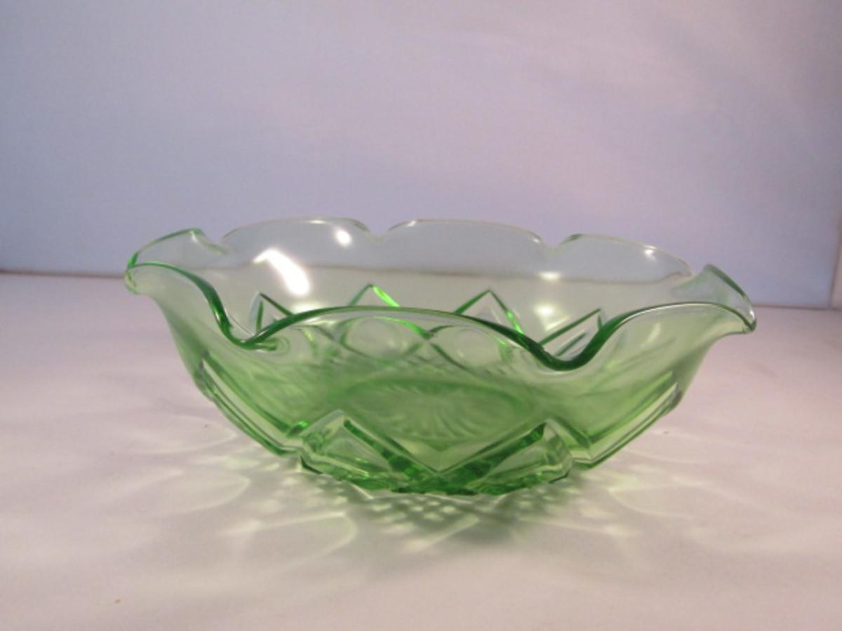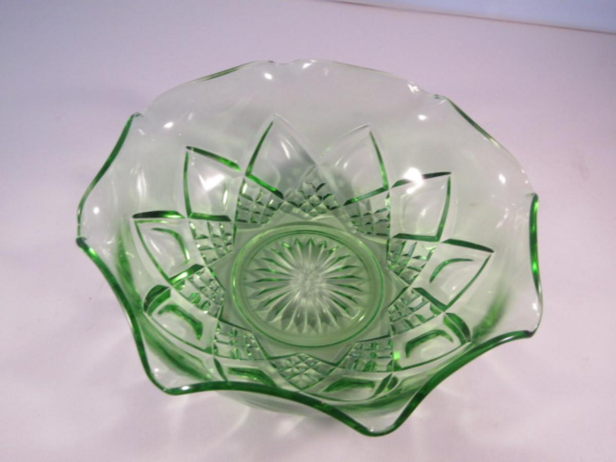 Vintage Hazel Atlas Uranium Glass Bowl with Ruffled Edge- Approx 8 3/4" in Diameter