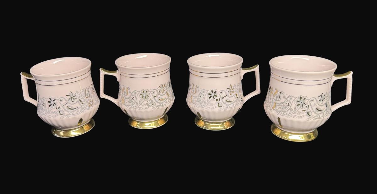 Footed mug set with gold accents. Age related wear. Total of four pieces. Measurement: 3.75"H (each). [RE]