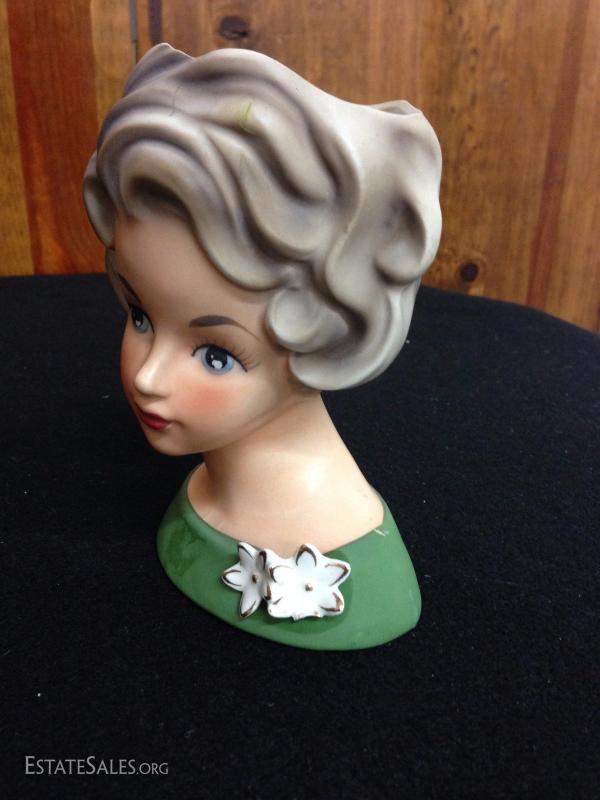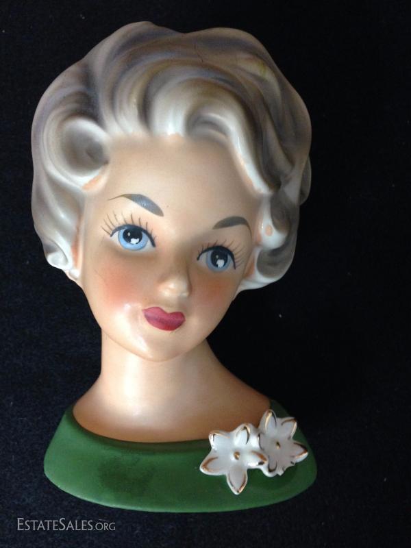 Elegant China, Glassware, Head Vases, Porcelain Figurines, Easter Goodies, Vintage Dolls, Gloves. Royal Copley & Hull, Asian Lamps, Animal Brooches, Candle Sticks, Level, & Sieves.