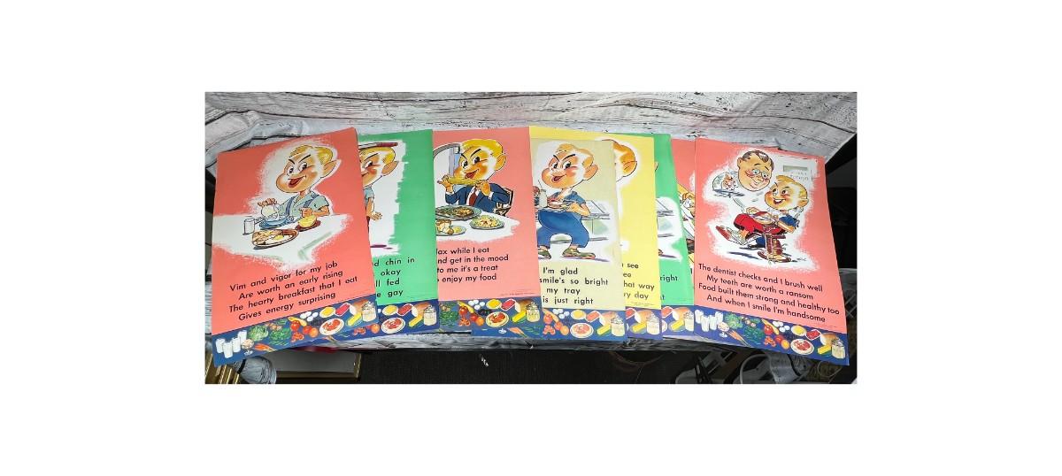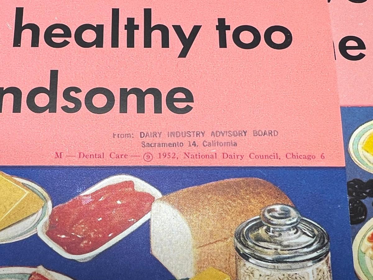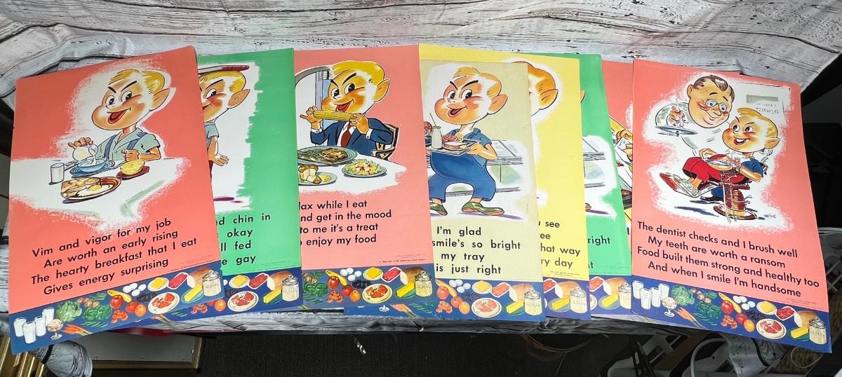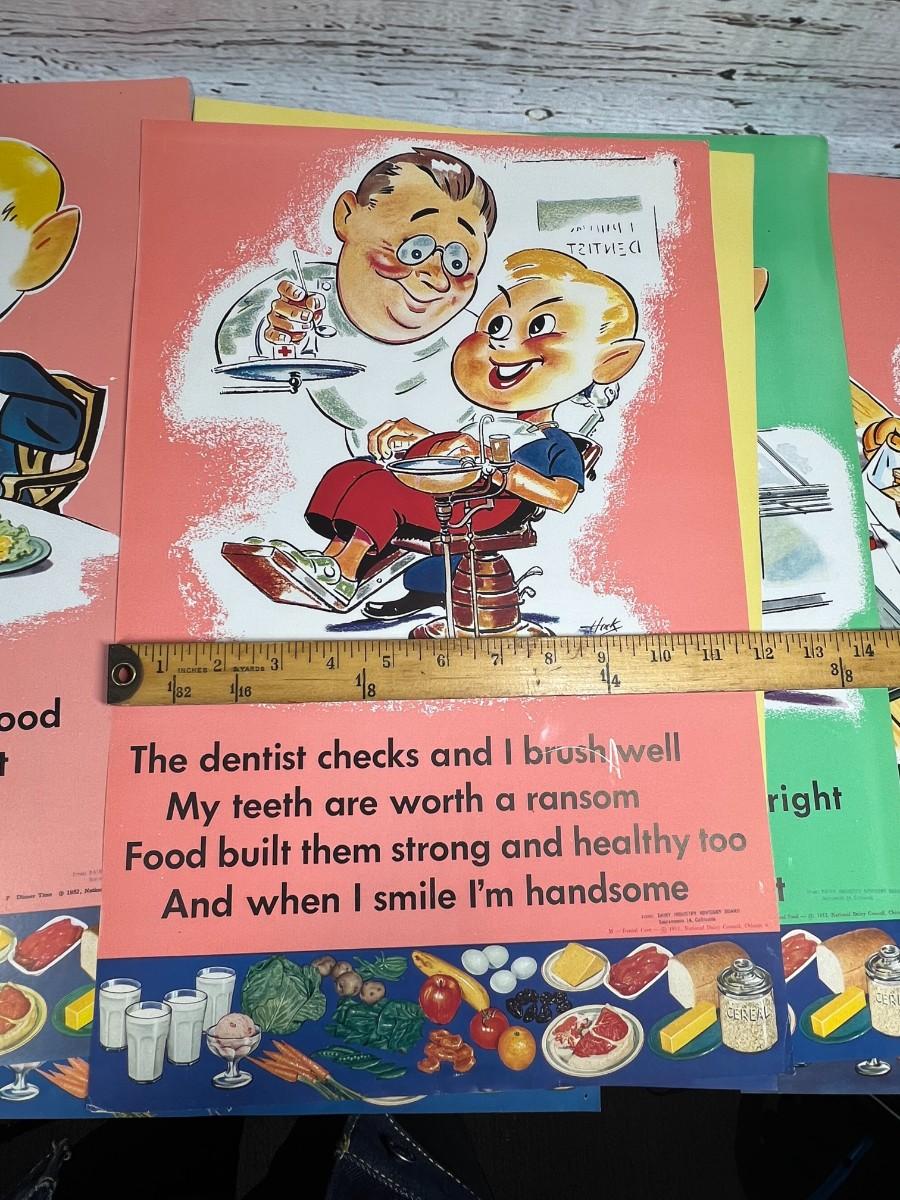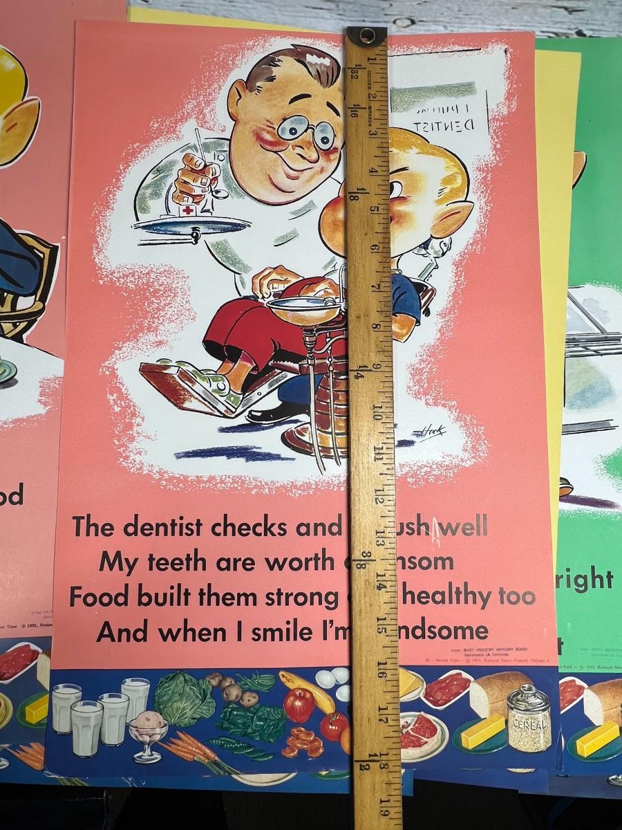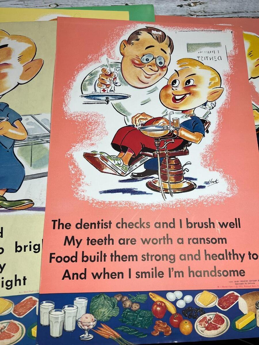 Vintage 1952 Healthy Habits educational posters from the National Dairy Council. In good vintage condition, some worn corners.