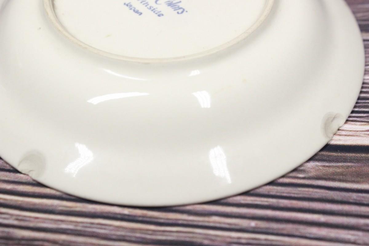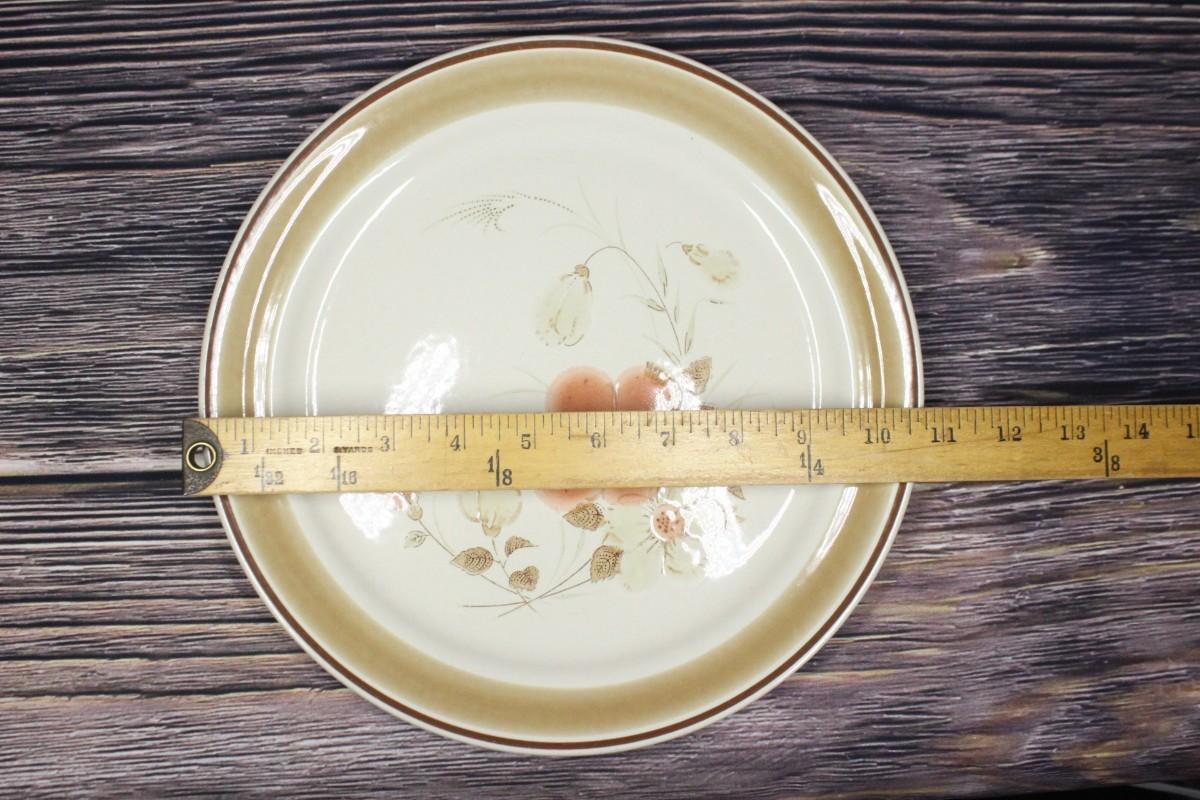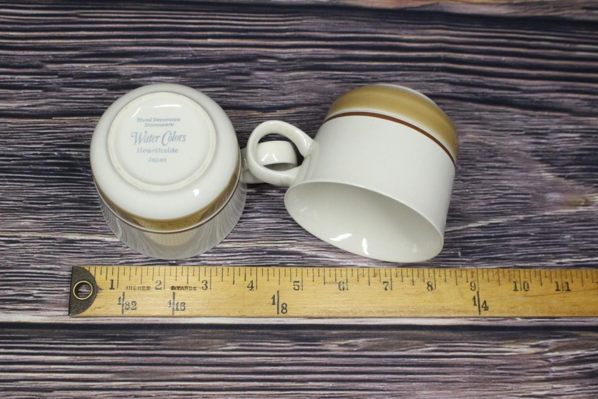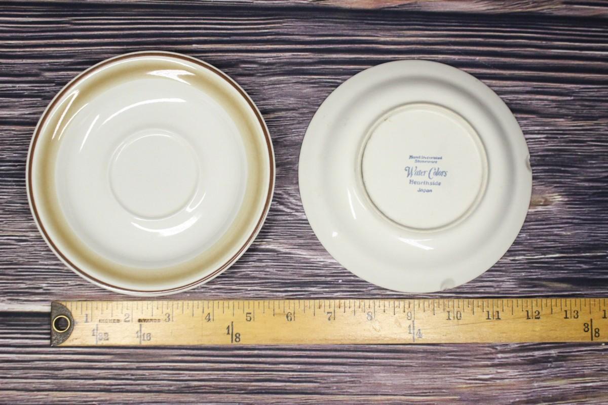 Vintage Hearthside Japan Hand Decorated Stoneware Set, there is two chip on one of the serving dishes pictured above. The rest of the stoneware set has no significant scratches or chips. Comes with one 10.5" plate, two small coffee cups, and four 5" serving dishes.