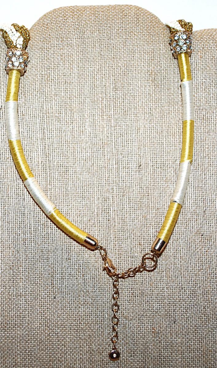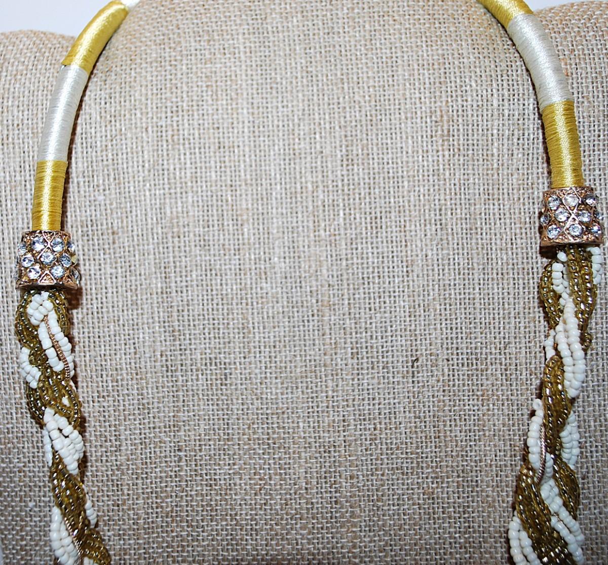 Vintage Heavily Gold & White Beaded and Intertwined NECKLACE - Marked "1946" with Bejeweled Caps and Rope Style Upper & Lobster Clasp 30" L