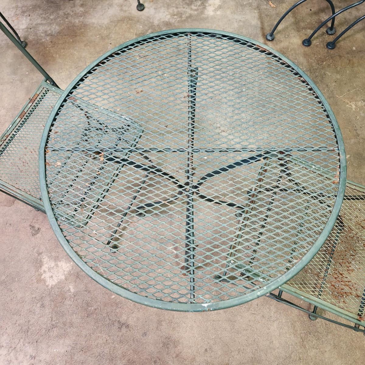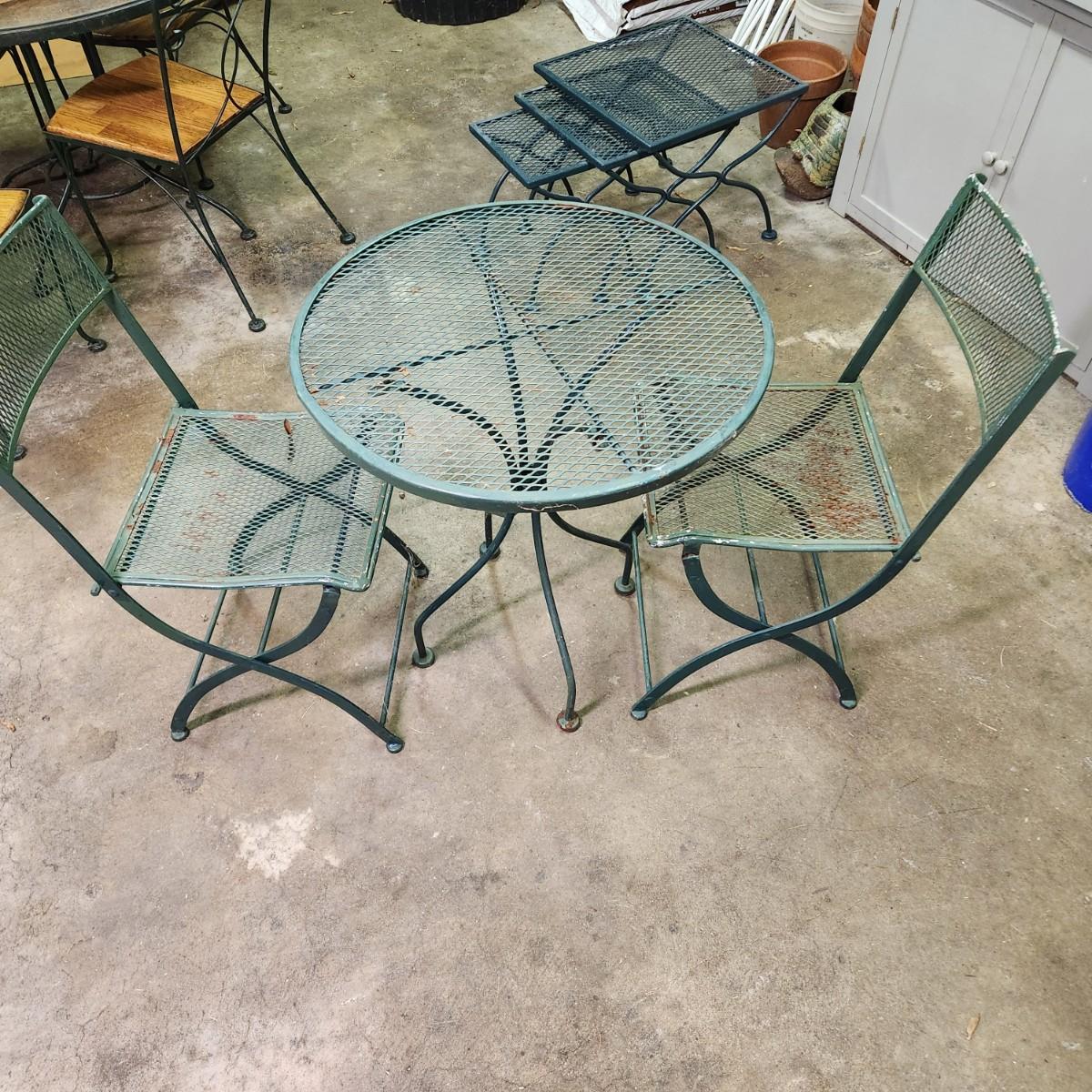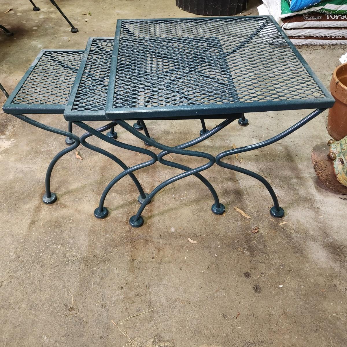 Vintage Heavy Metal Mesh Patio Set w 2 folding chairs 3 Nesting Tables