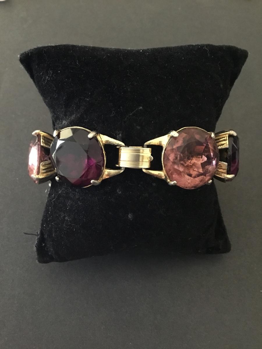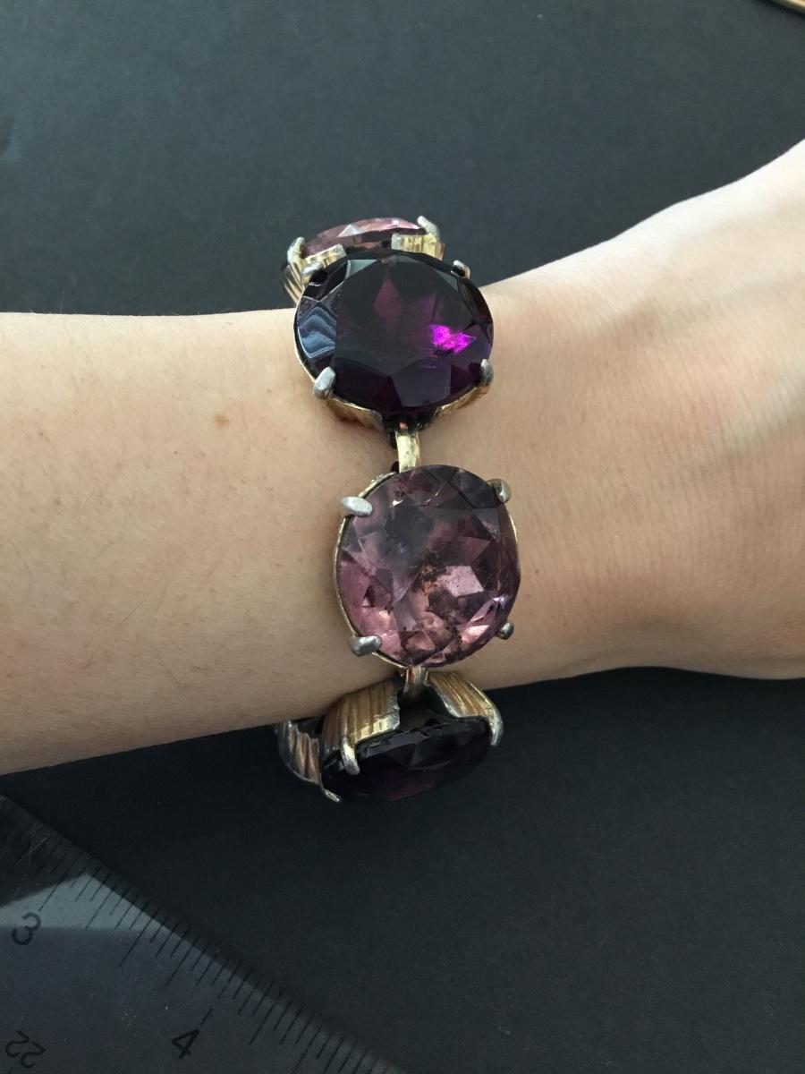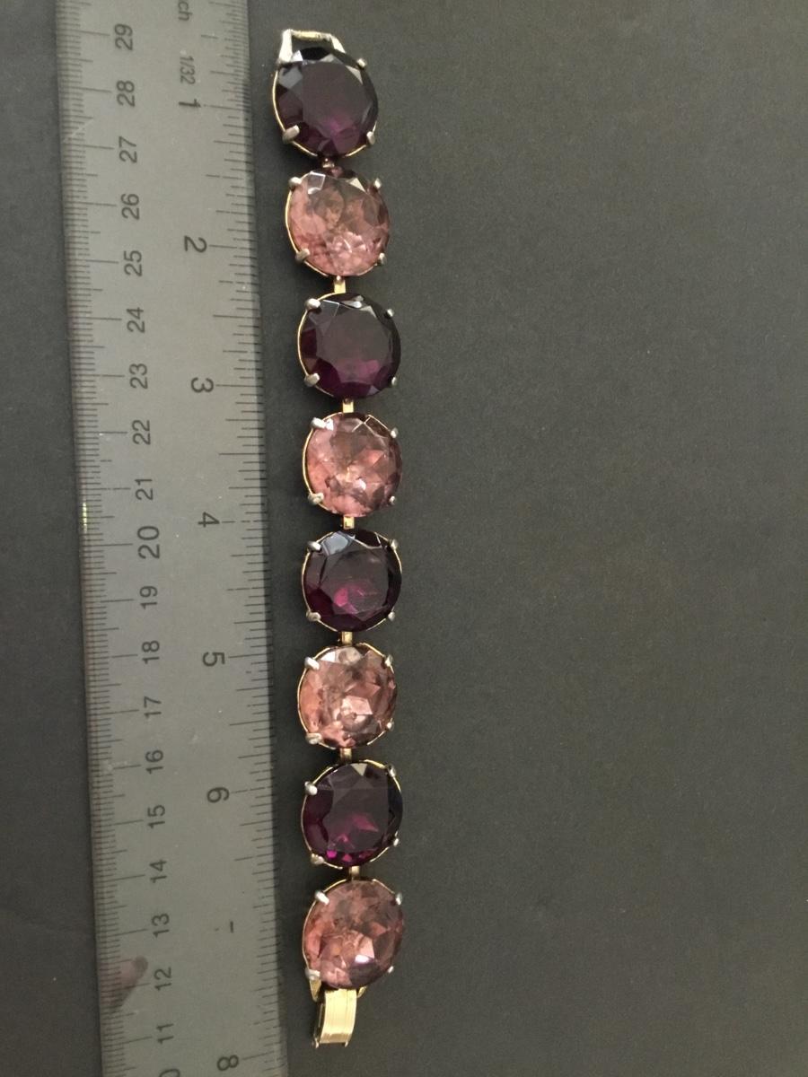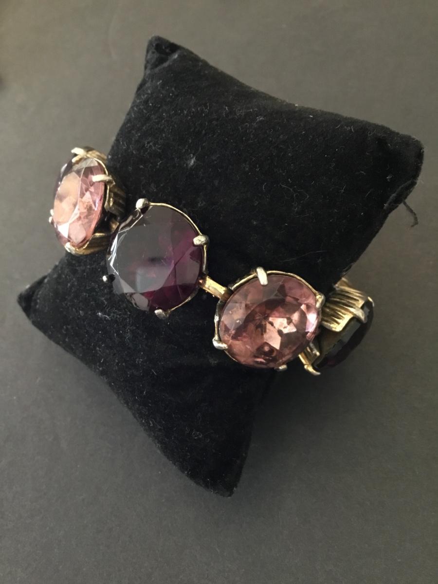 Vintage, heavy, pink, purple faceted glass, rhinestone link bracelet