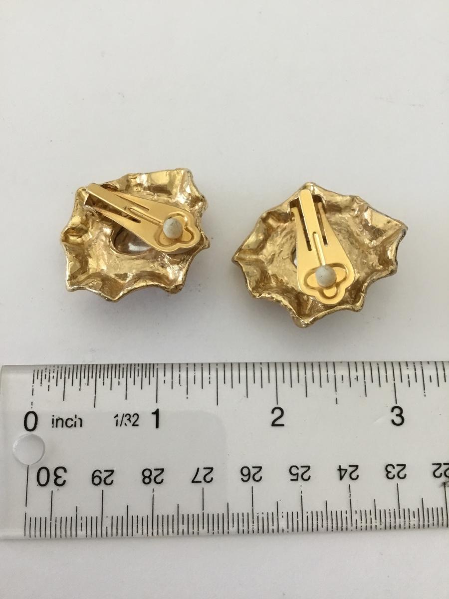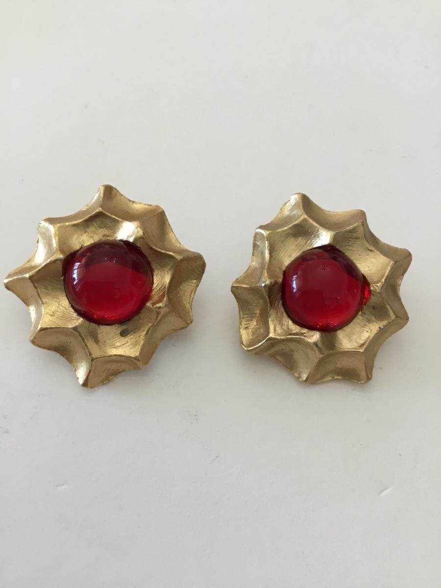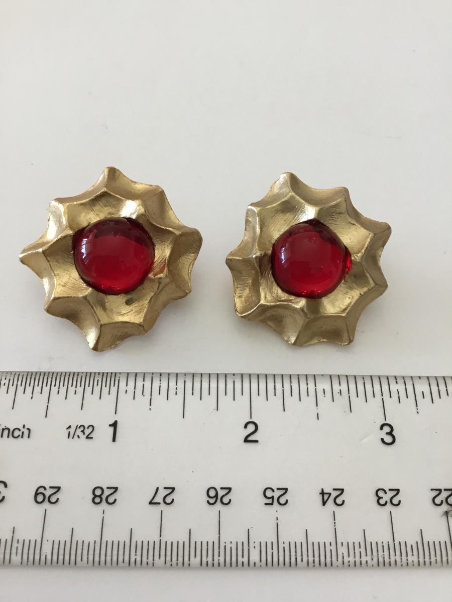 Vintage, heavy satin, gold, toned faux red stone clip on earrings