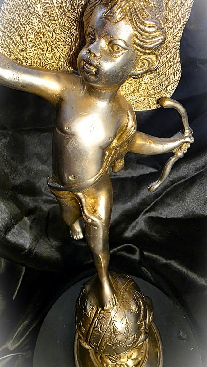 Vintage Heavy Solid Brass Cupid (Eros) Statue on Celestial Globe – 17” French Art Nouveau–Inspired Classical Sculpture