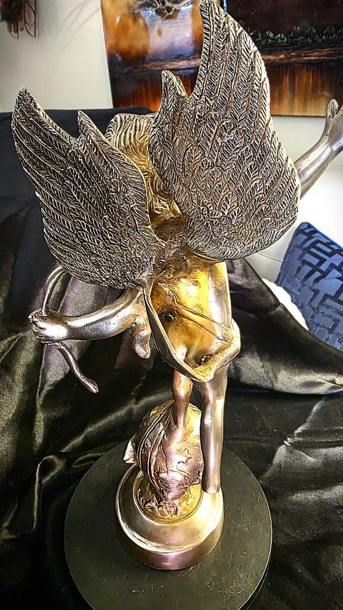 There are pieces that decorate a space—and then there are pieces that command it. This striking winged Cupid, also known as Eros, rises with authority atop a celestial globe, frozen in a moment of myth and motion. One foot balances on a star-etched sphere while his wings spread wide, bow drawn, arm extended forward as if mid-flight through the heavens. The pose is dynamic, expressive, and unmistakably classical, evoking the romance and symbolism of Old World European sculpture.