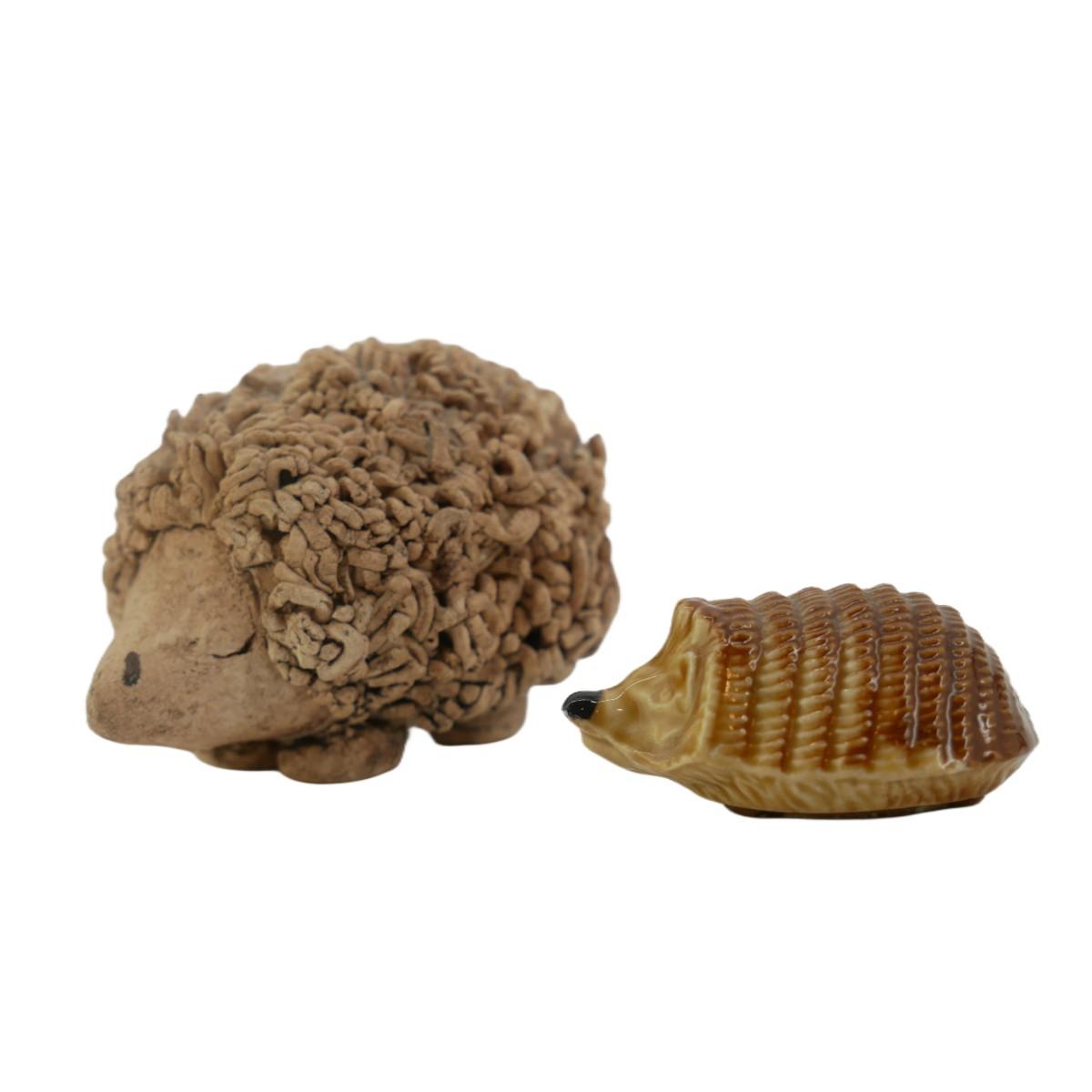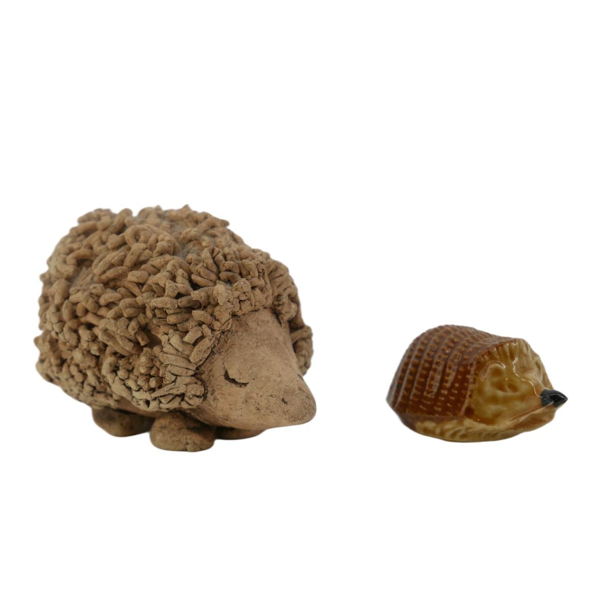 Vintage handmade spaghetti clay hedgehog figurine, measures L 2.5" x H 1.75". Vintage Wade England handpainted and glazed mini hedgehog figurine, measures L 1.75" x H .75".