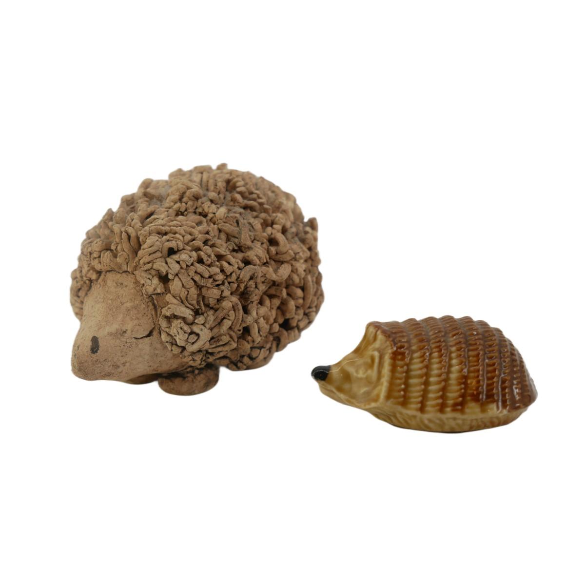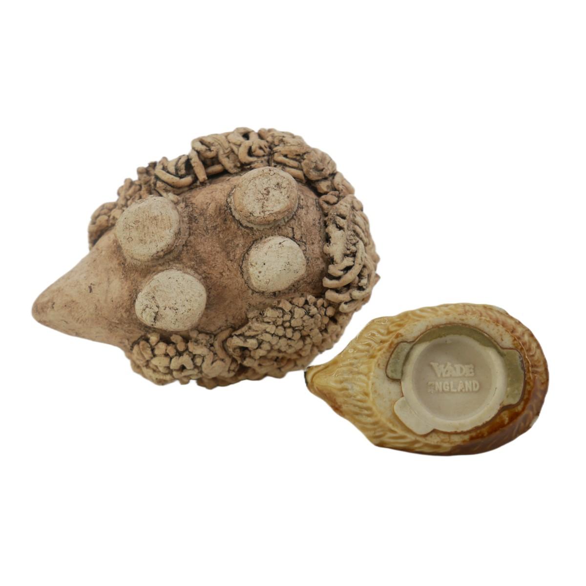 Vintage handmade spaghetti clay hedgehog figurine, measures L 2.5" x H 1.75". Vintage Wade England handpainted and glazed mini hedgehog figurine, measures L 1.75" x H .75".