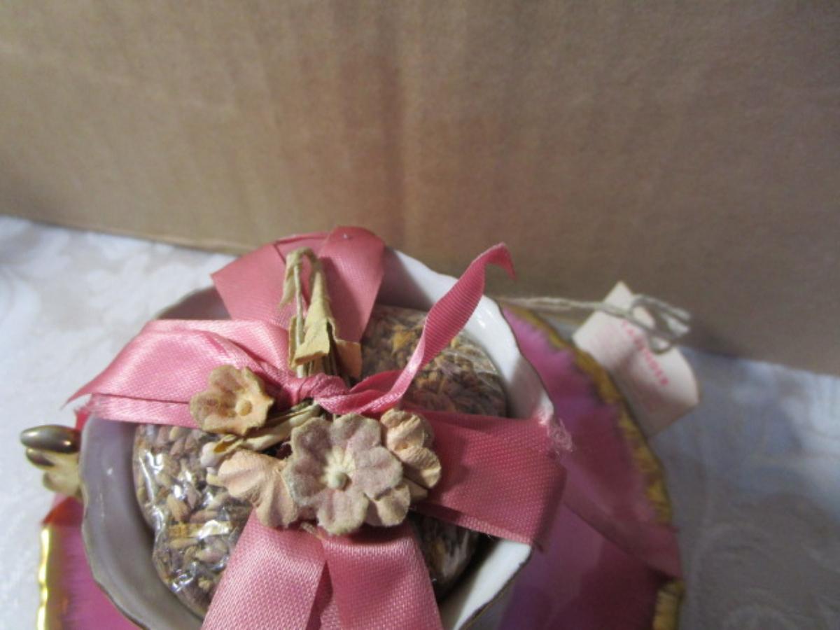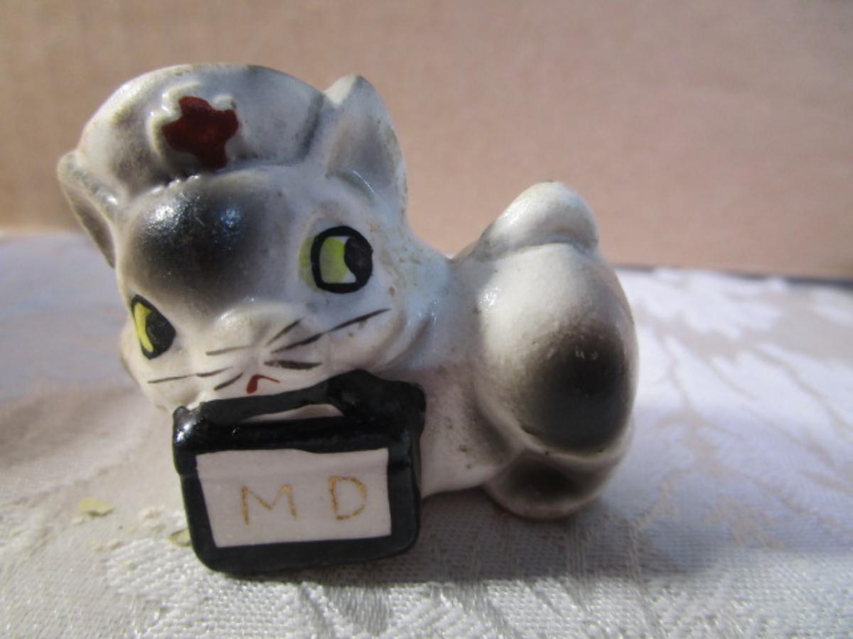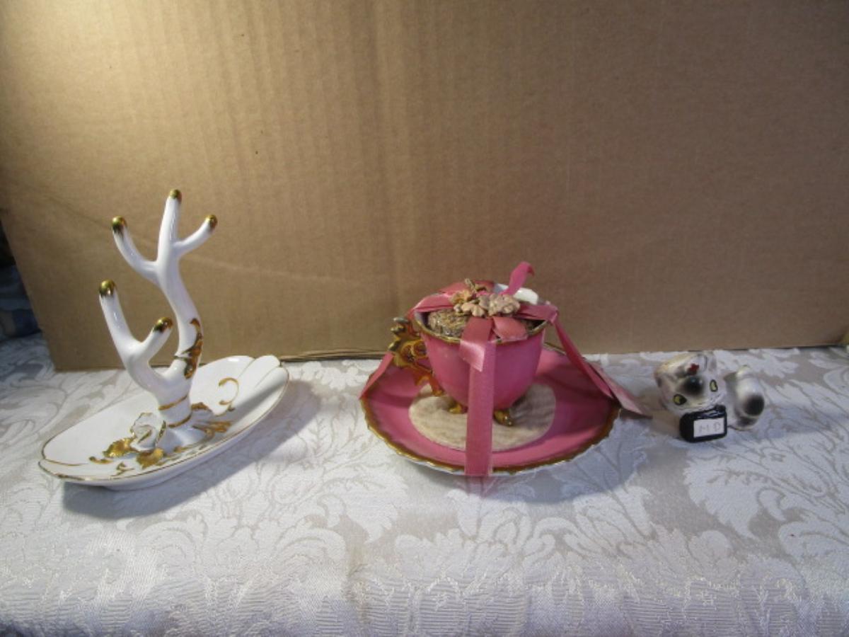 Vintage Herbery Gardens sachet, Lefton's porcelain ring holder, kitty salt shaker