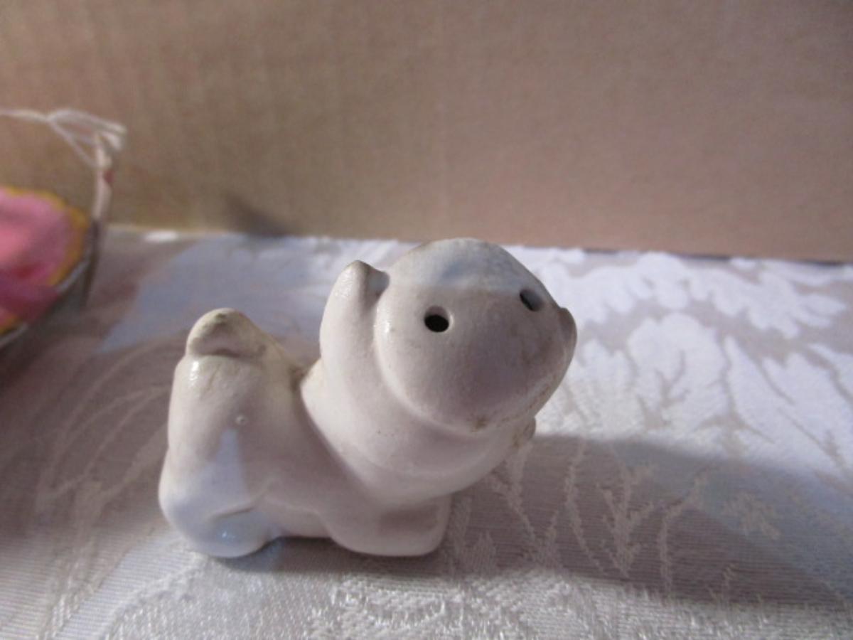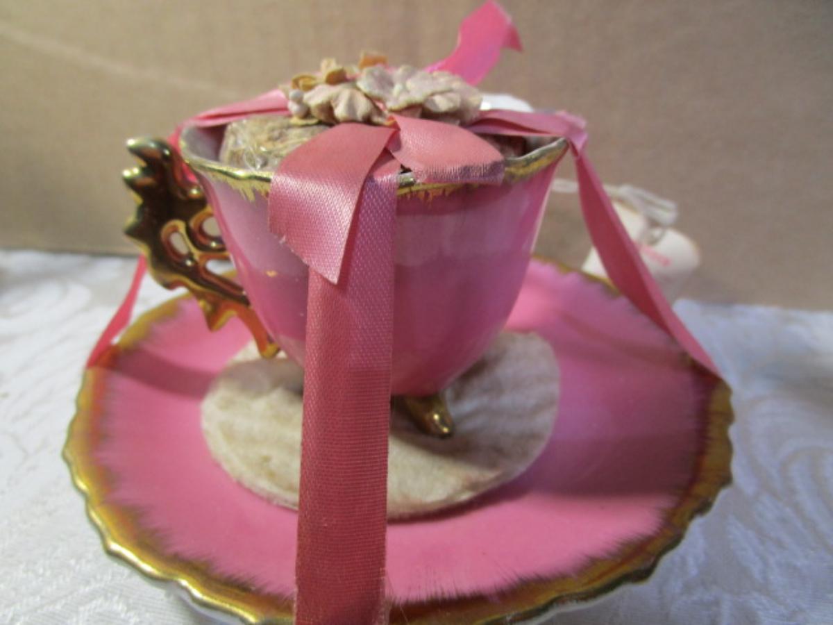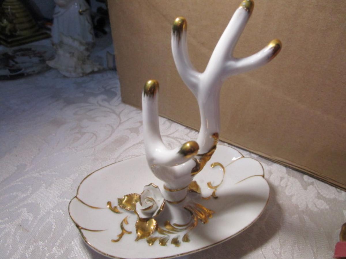 Vintage Herbery Gardens sachet, Lefton's porcelain ring holder, kitty salt shaker