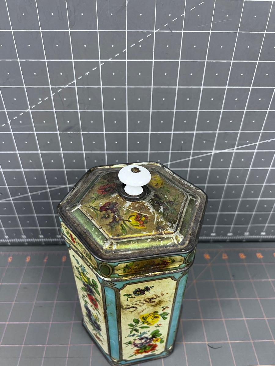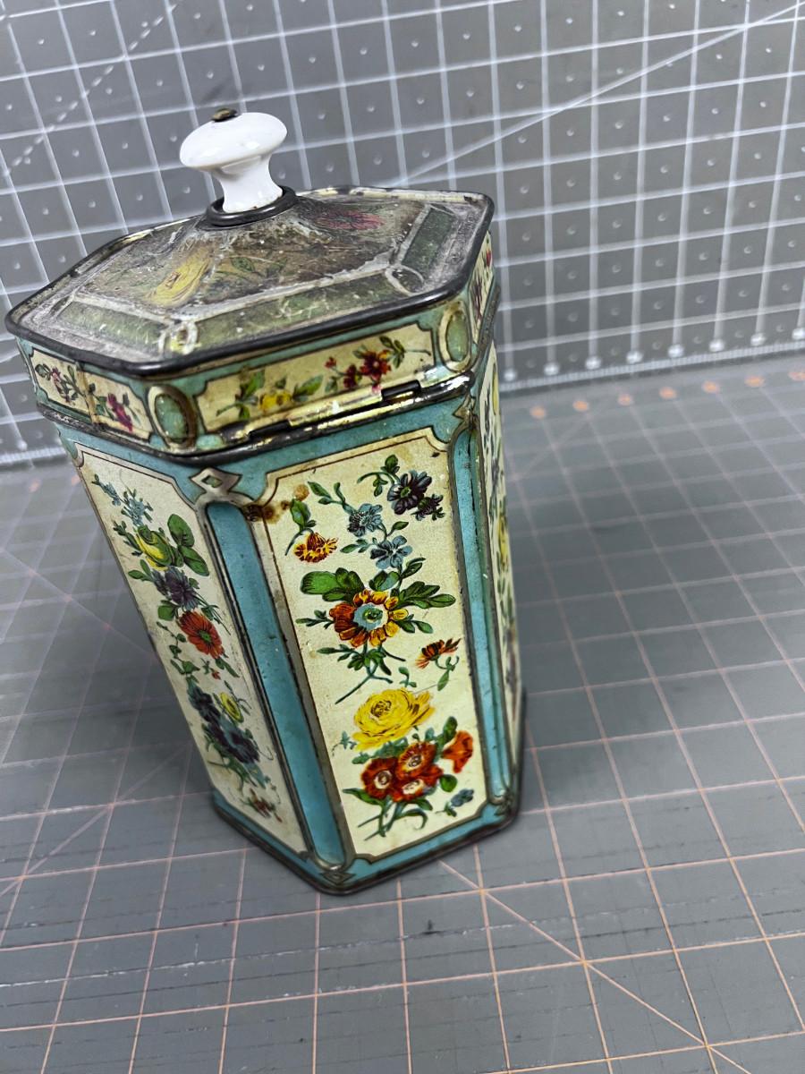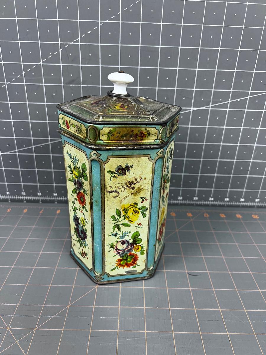 Vintage Hexagon TIN Cream, Turquoise & Floral With Lid WITH A PORCELAIN KNOB ON TOP! Hinged!!!