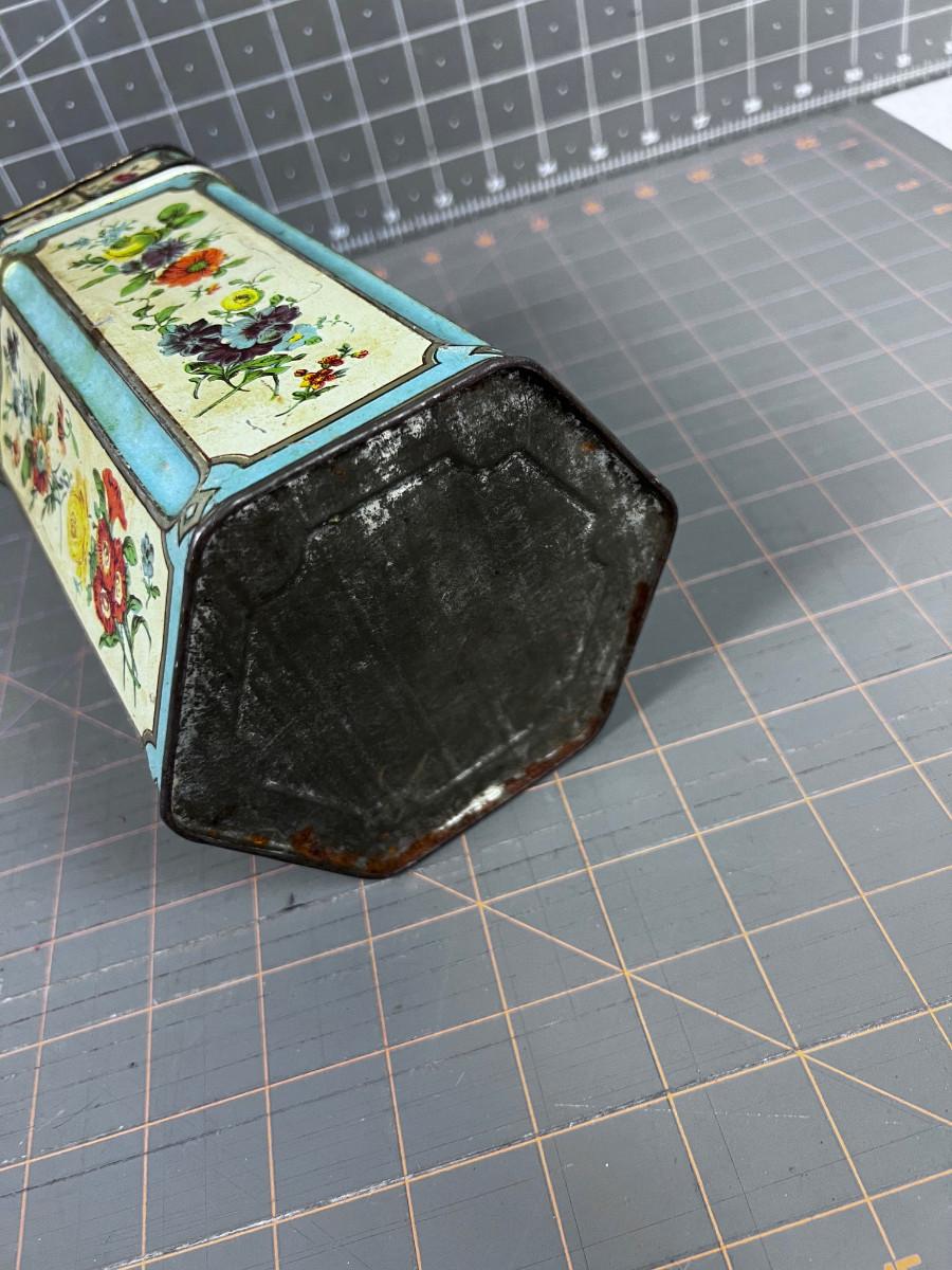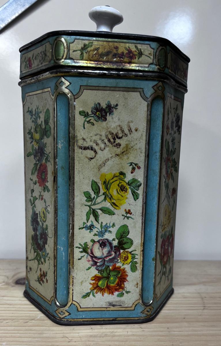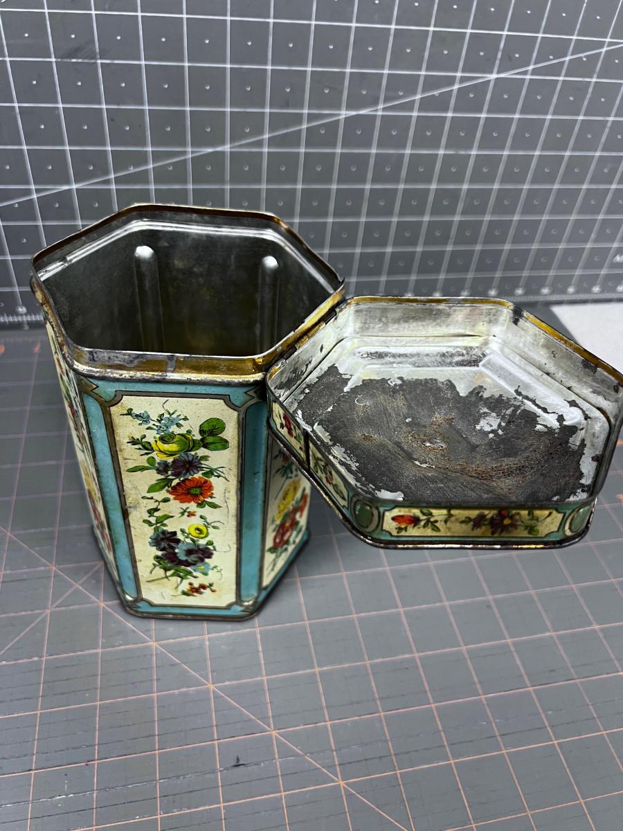 Vintage Hexagon TIN Cream, Turquoise & Floral With Lid WITH A PORCELAIN KNOB ON TOP! Hinged!!!