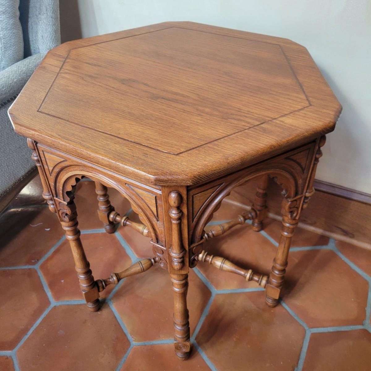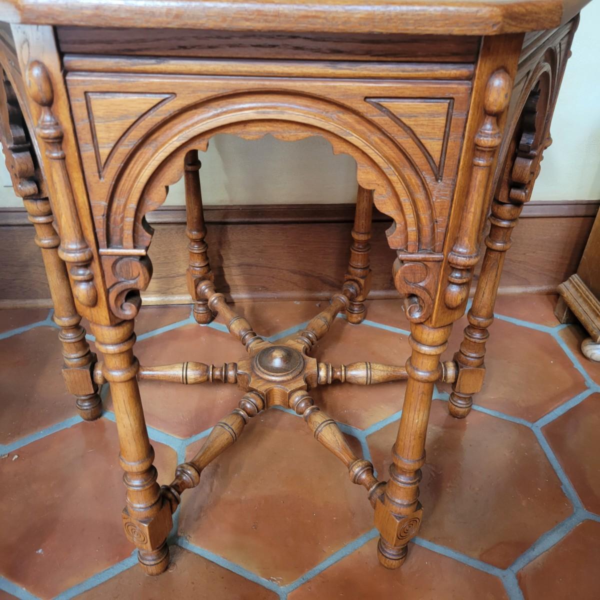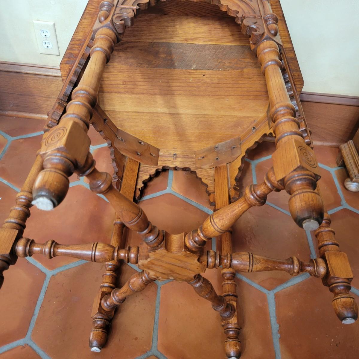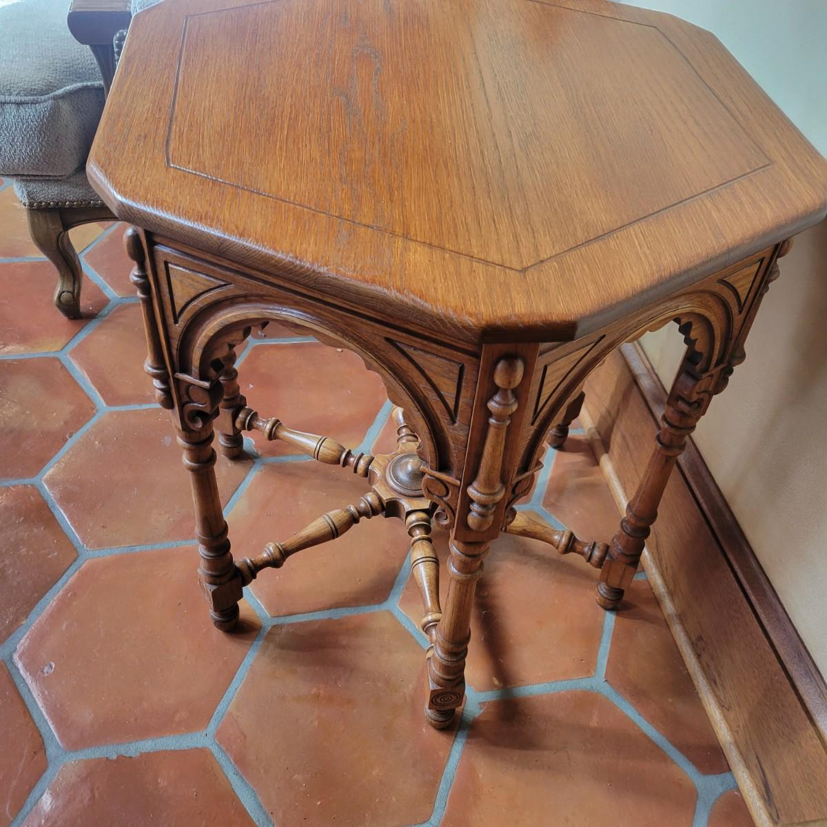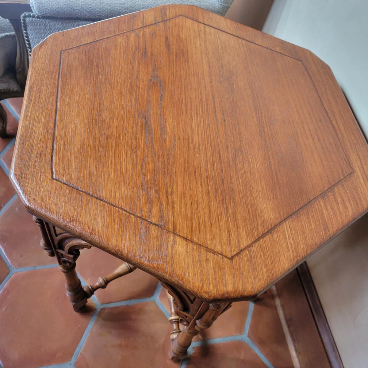 A vintage hexagonal side table that appears to be made out of oak. It has carved details with an inernal support that looks similar to wagon wheel spokes. It measures approximately 28.5"D x 28"H. Local pickup only