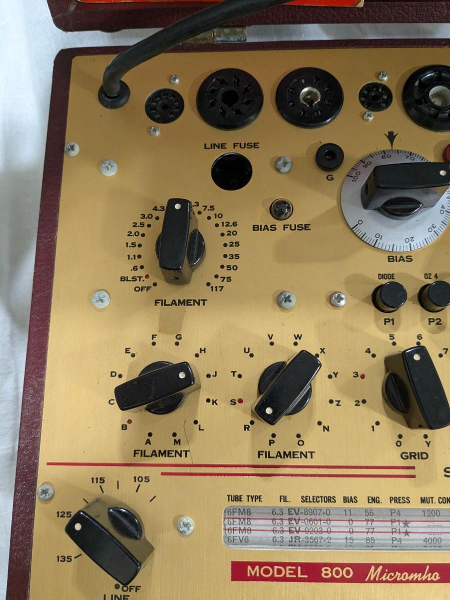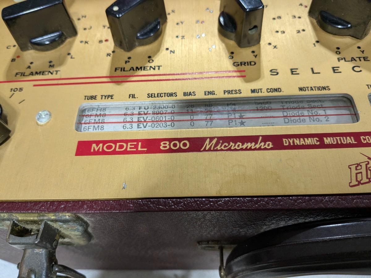 Hickok Model 800 Micromho Dynamic Mutual Conductance Tube-Transistor Tester. It is a vintage piece of test equipment used for evaluating vacuum tubes and transistors.