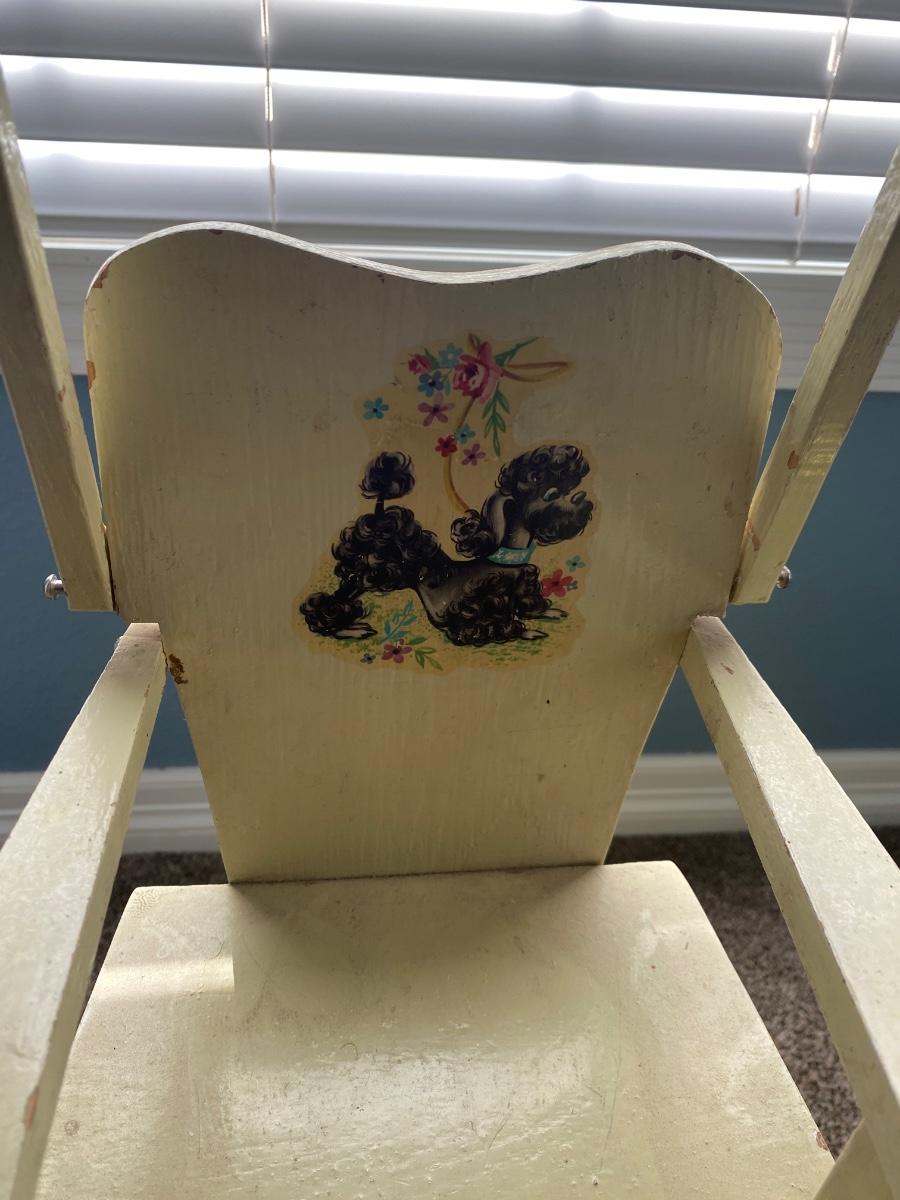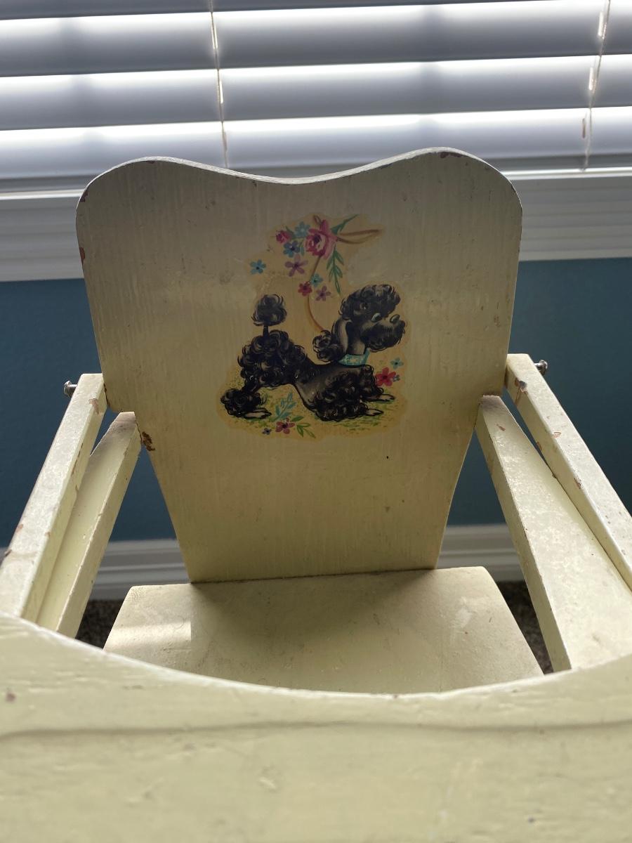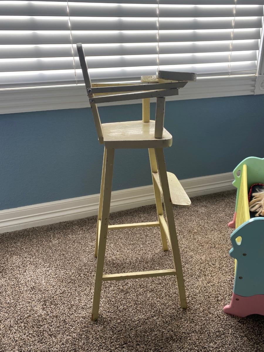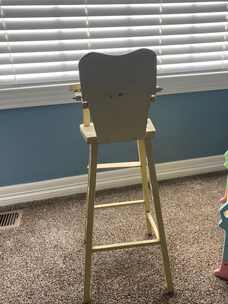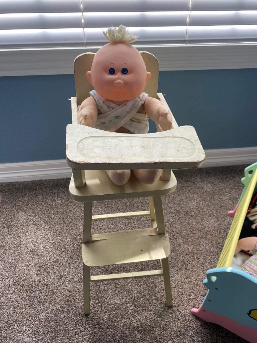 VINTAGE HIGH CHAIR AND CABBAGE PATCH DOLL