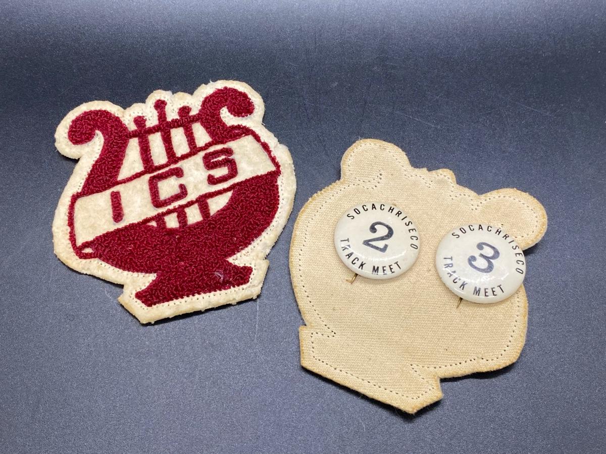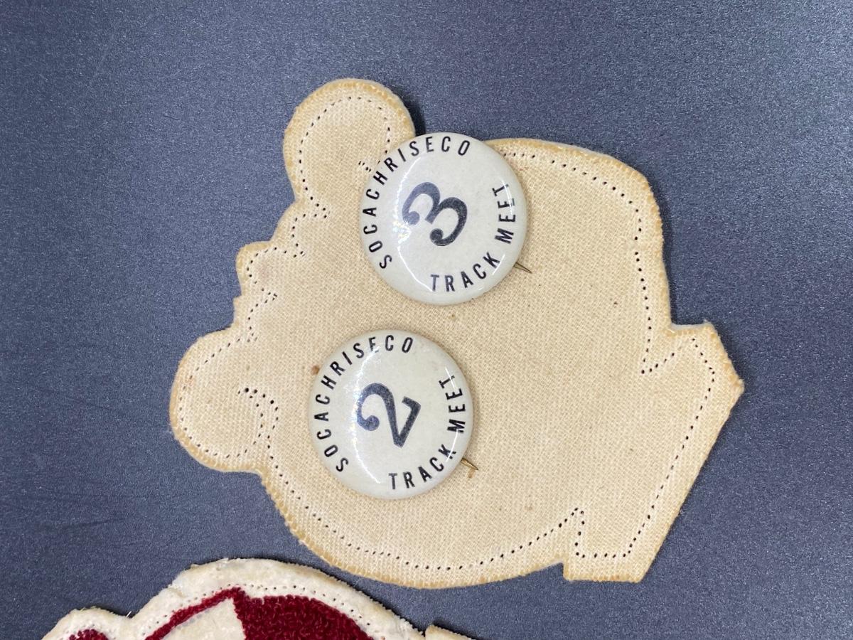 Vintage High School Letterman Jacket Collegiate Patches and Track Pins Buttons