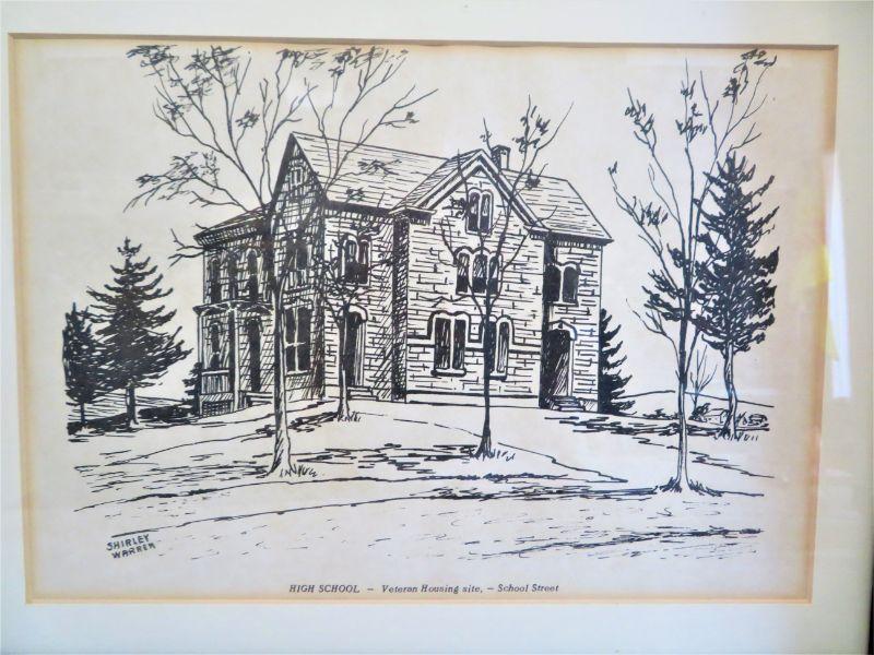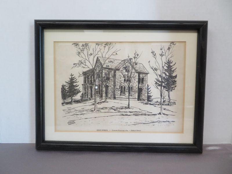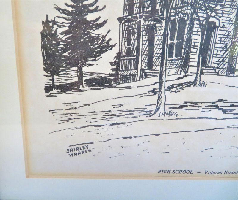 Vintage HIGH SCHOOL - Veteran Housing Site, - School Street. Signed by Shirley WARREN, Ink on Board Framed ART. Black wood Frame. Measures 10" x 13". Please preview and email questions / concerns prior to bidding. In Good Condition for its age.