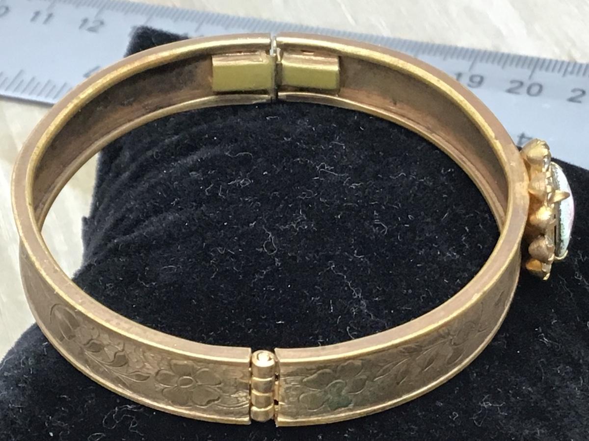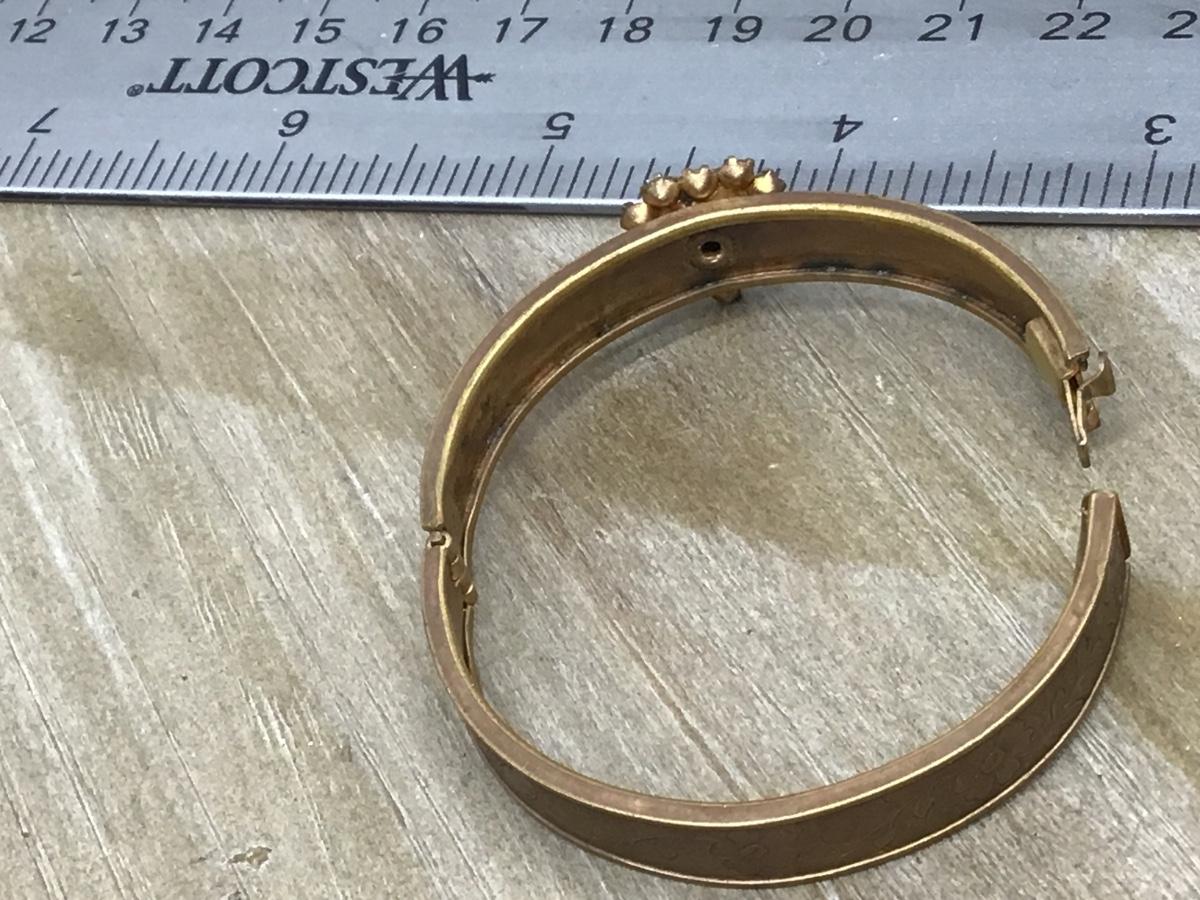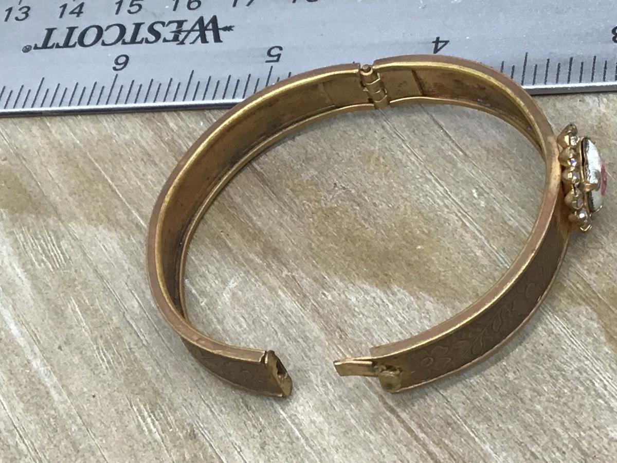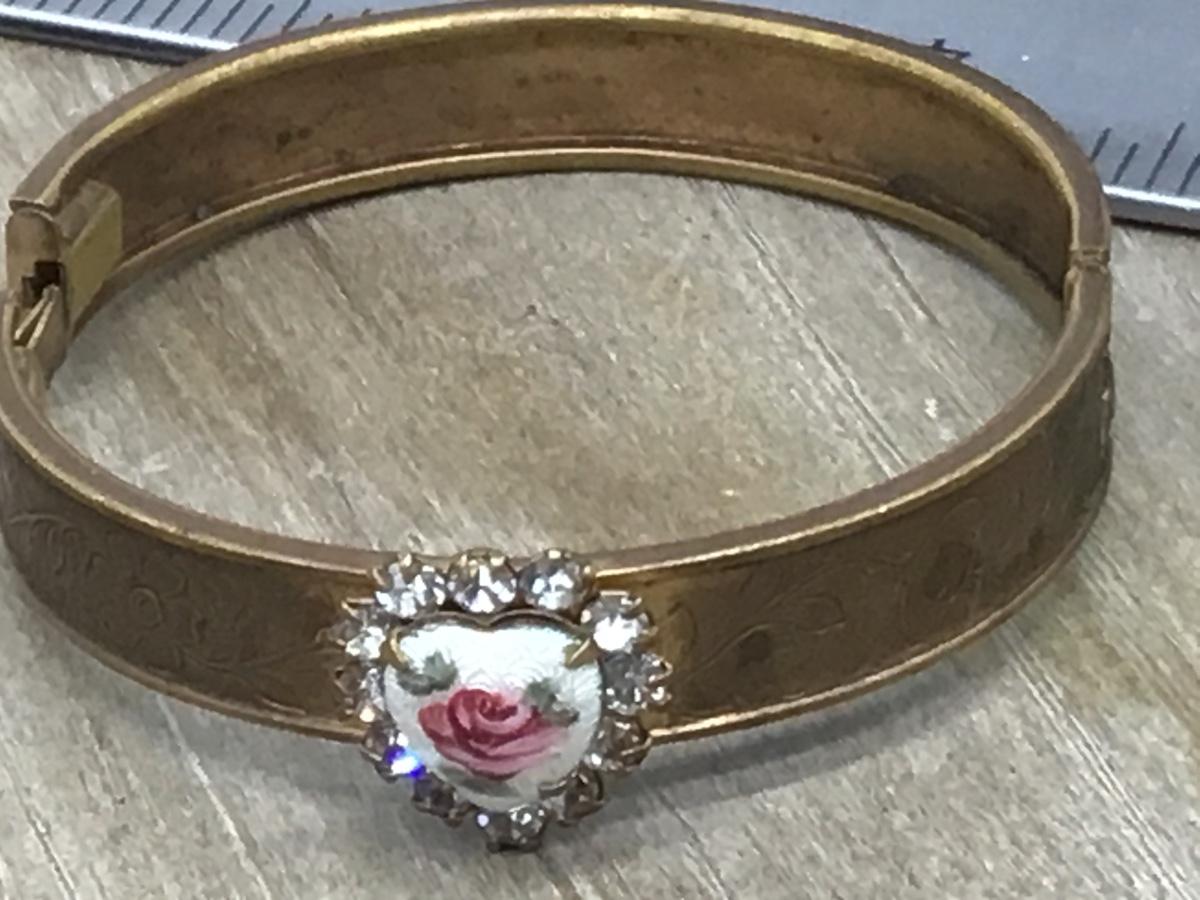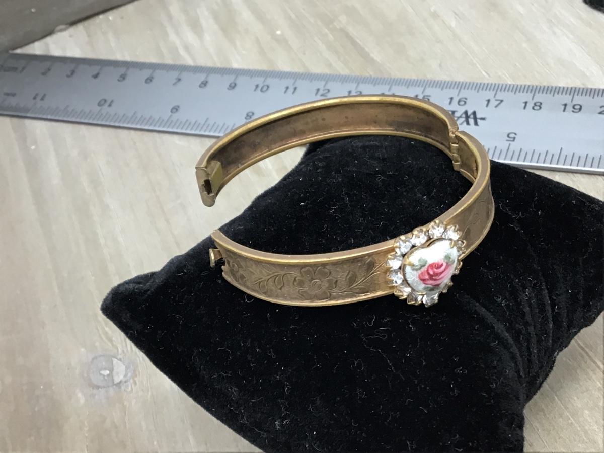 Vintage Hinged Childrens Cuff porcelain Rose Faux Diamonds scroll etching