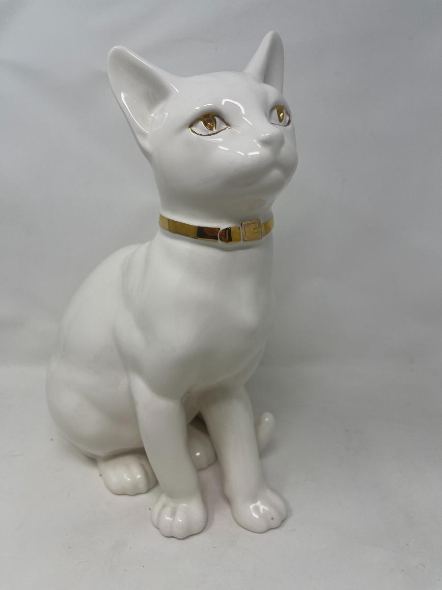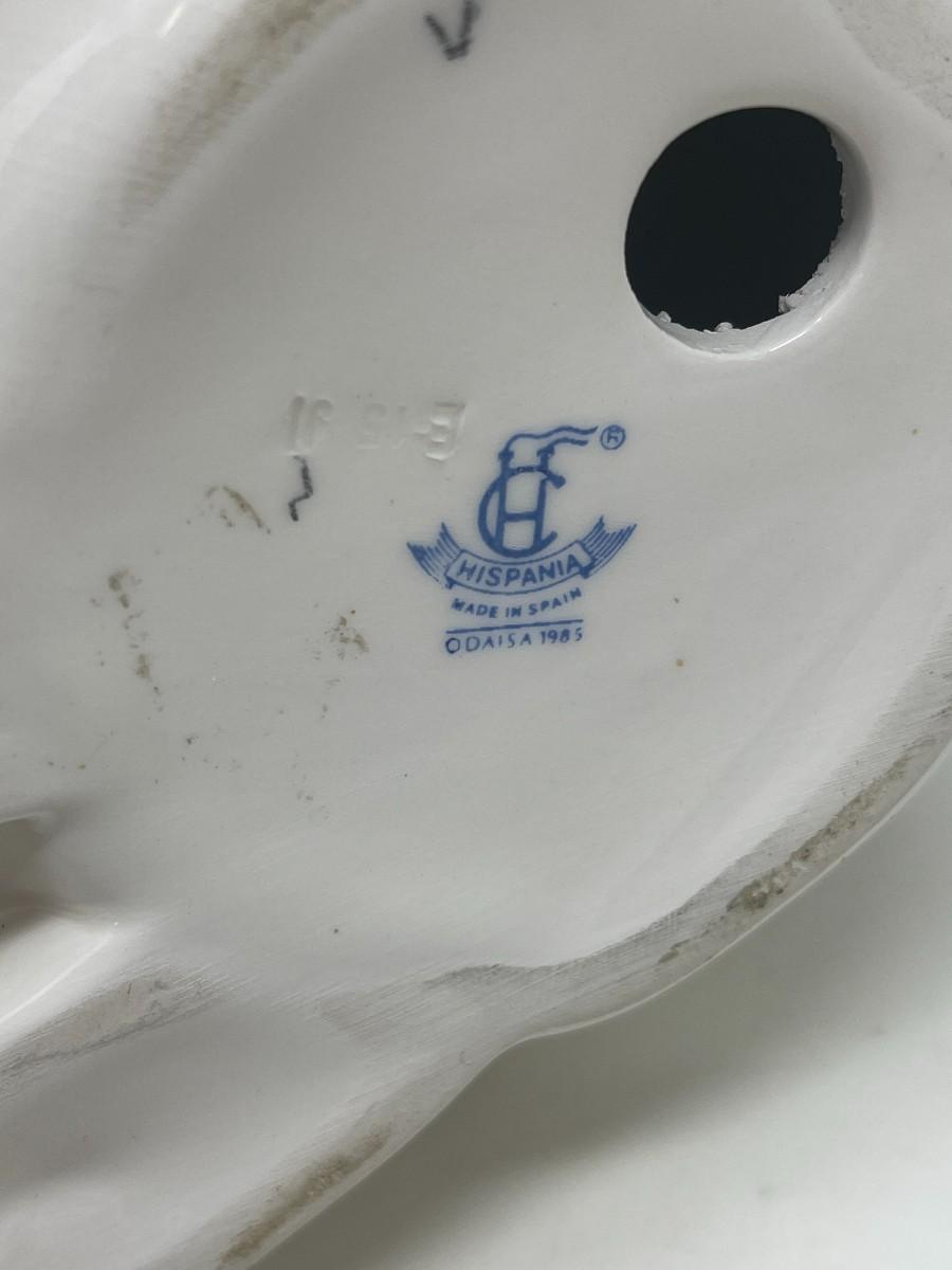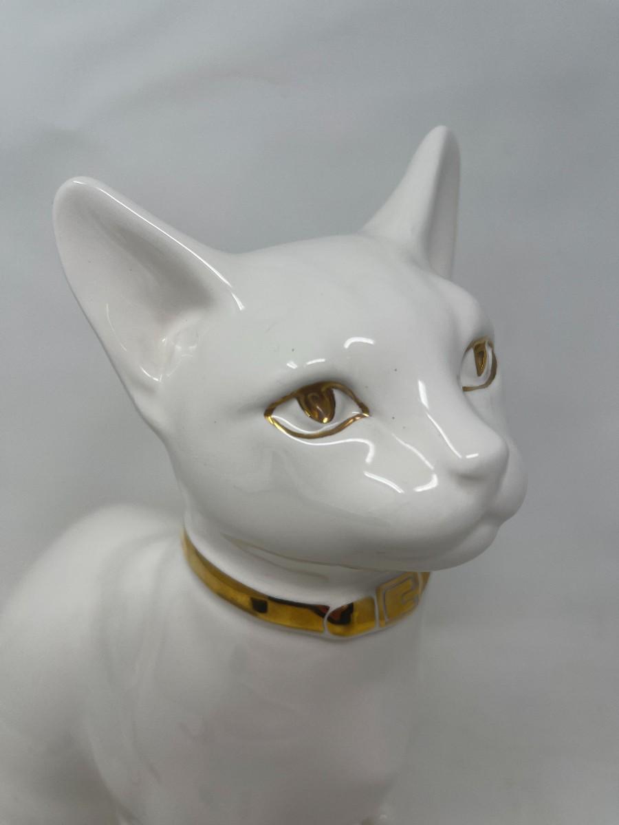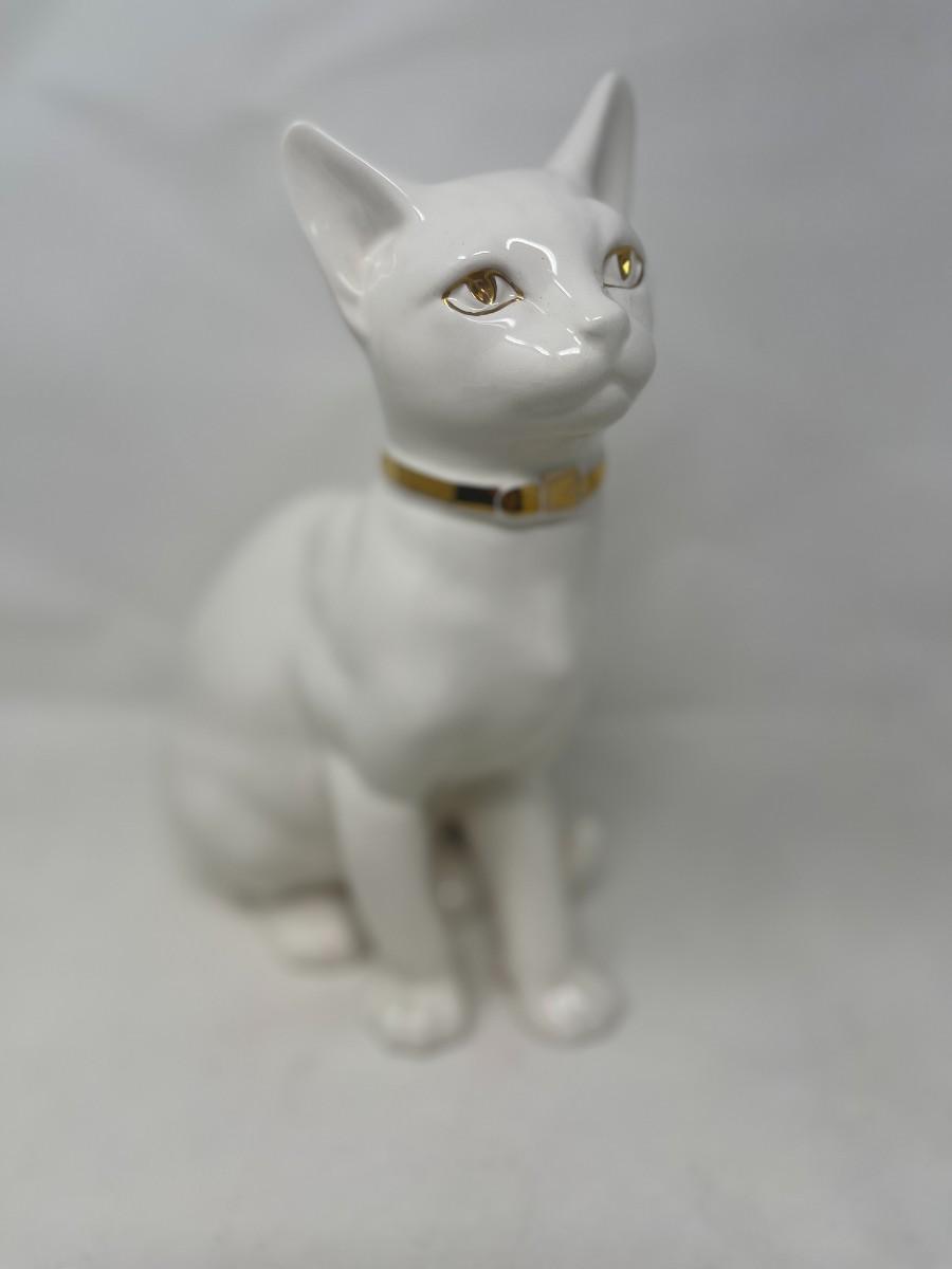 The Lladro brothers were associated with Hispania commencing in the 1940's. Upon founding their shop in 1941, the Lladro brothers sold Hispania figurines there from the 40's until the 80's, when it closed. This listing is for a marked Hispania creamy white cat with gold collar and eyes. This stunning cat measures 10" tall and is 8" from front paw to back. The piece is in very good condition, but does have a few production flaws apparent in the face. Please examine photos carefully. # 272