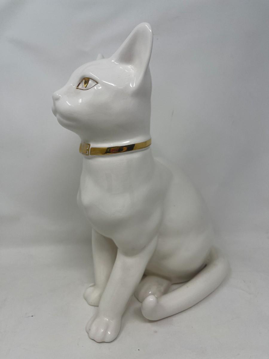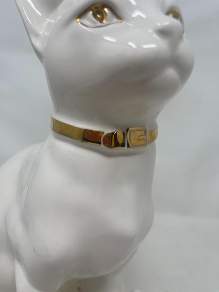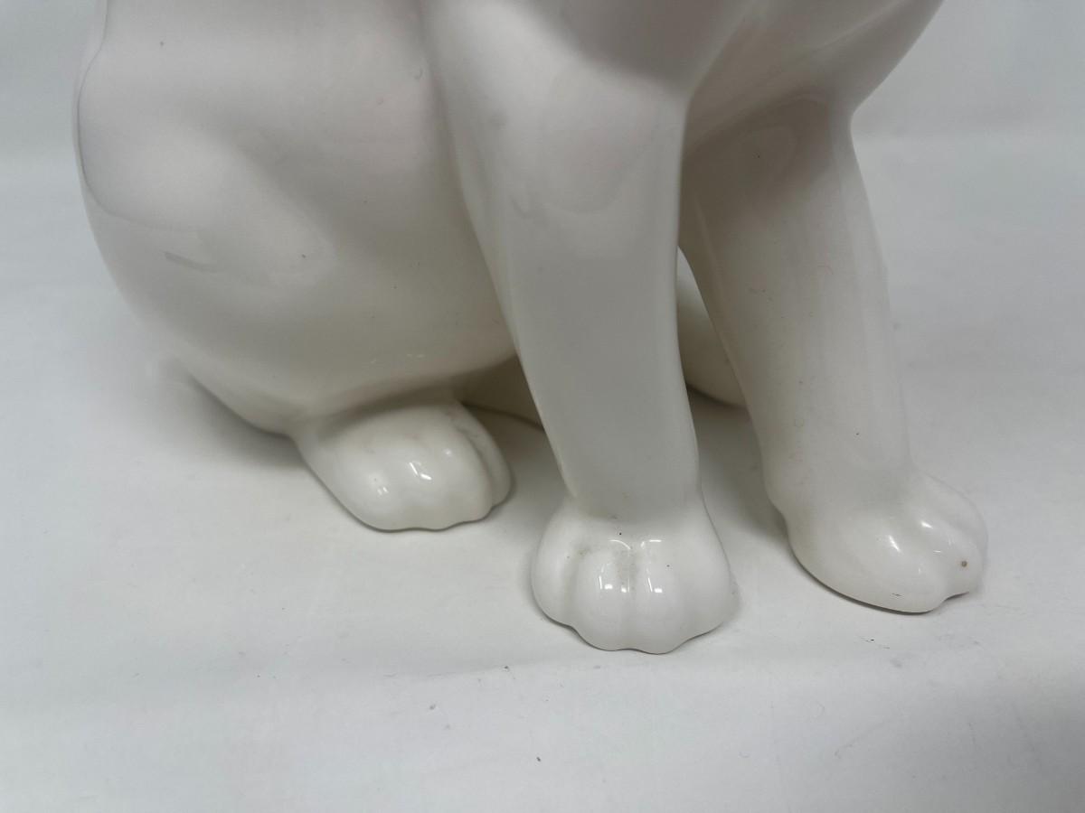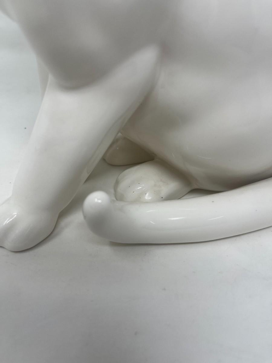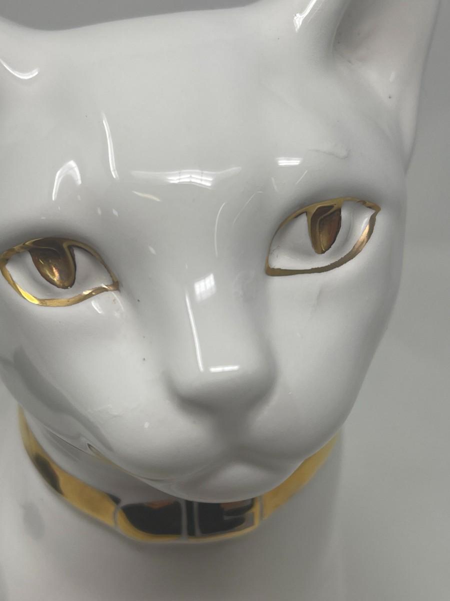 The Lladro brothers were associated with Hispania commencing in the 1940's. Upon founding their shop in 1941, the Lladro brothers sold Hispania figurines there from the 40's until the 80's, when it closed. This listing is for a marked Hispania creamy white cat with gold collar and eyes. This stunning cat measures 10" tall and is 8" from front paw to back. The piece is in very good condition, but does have a few production flaws apparent in the face. Please examine photos carefully. # 272