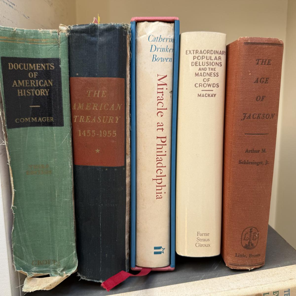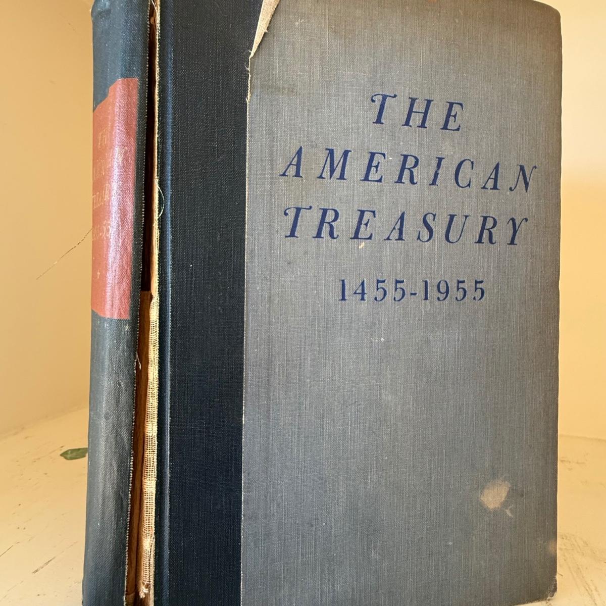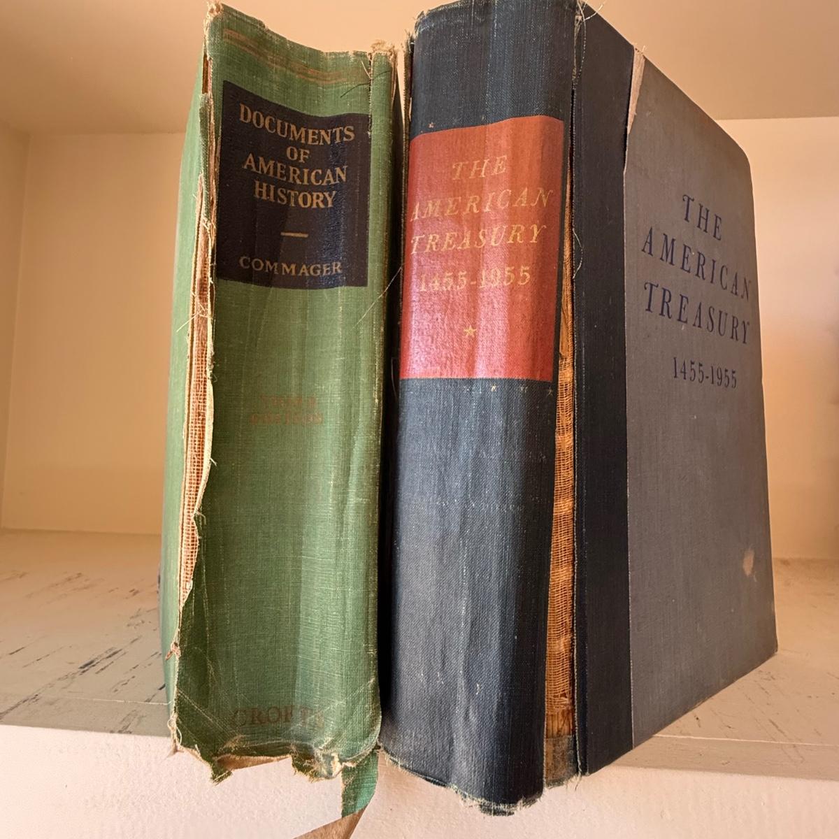 A collection of 11 vintage books, historical-themed or a part of American history. Notable titles include: “Ten Ever-Lovin’ Blue-Eyed Years with Pogo” by Walt Kelly and “Extraordinary Popular Delusions and the Madness of Crowds” by Charles McKay. The American Treasury book is a first edition. Books are all aged and show wear, some more than others. The binding is quite damaged on two of the books. Please see photos for inventory and details.