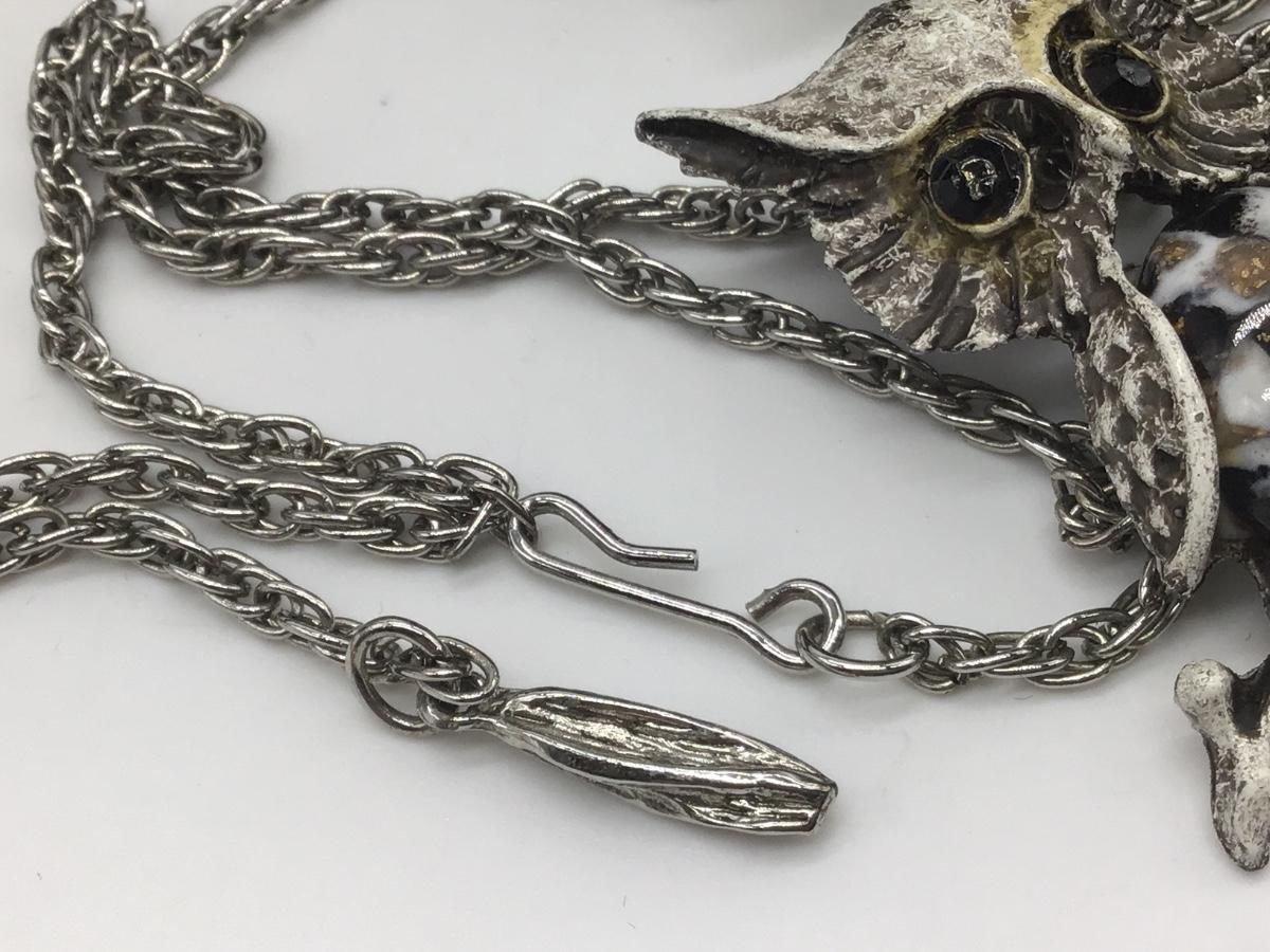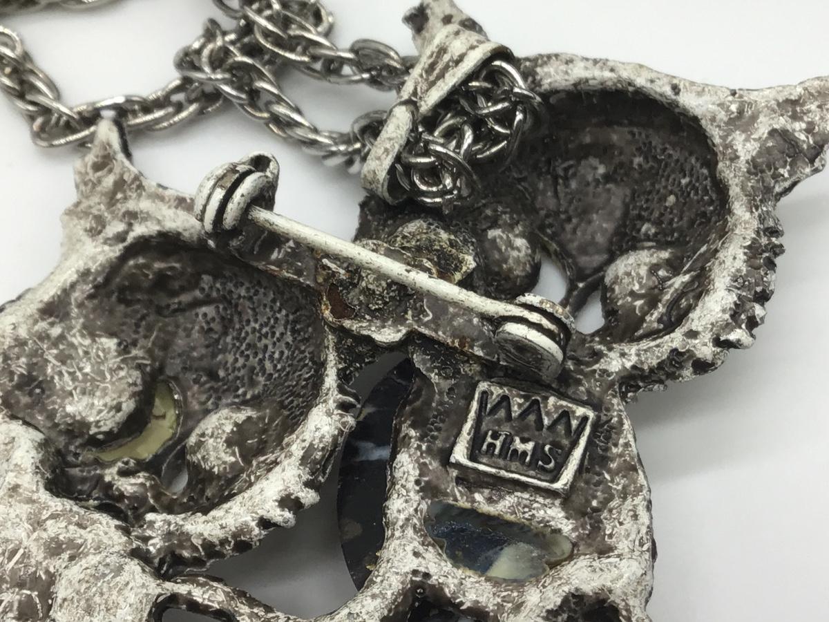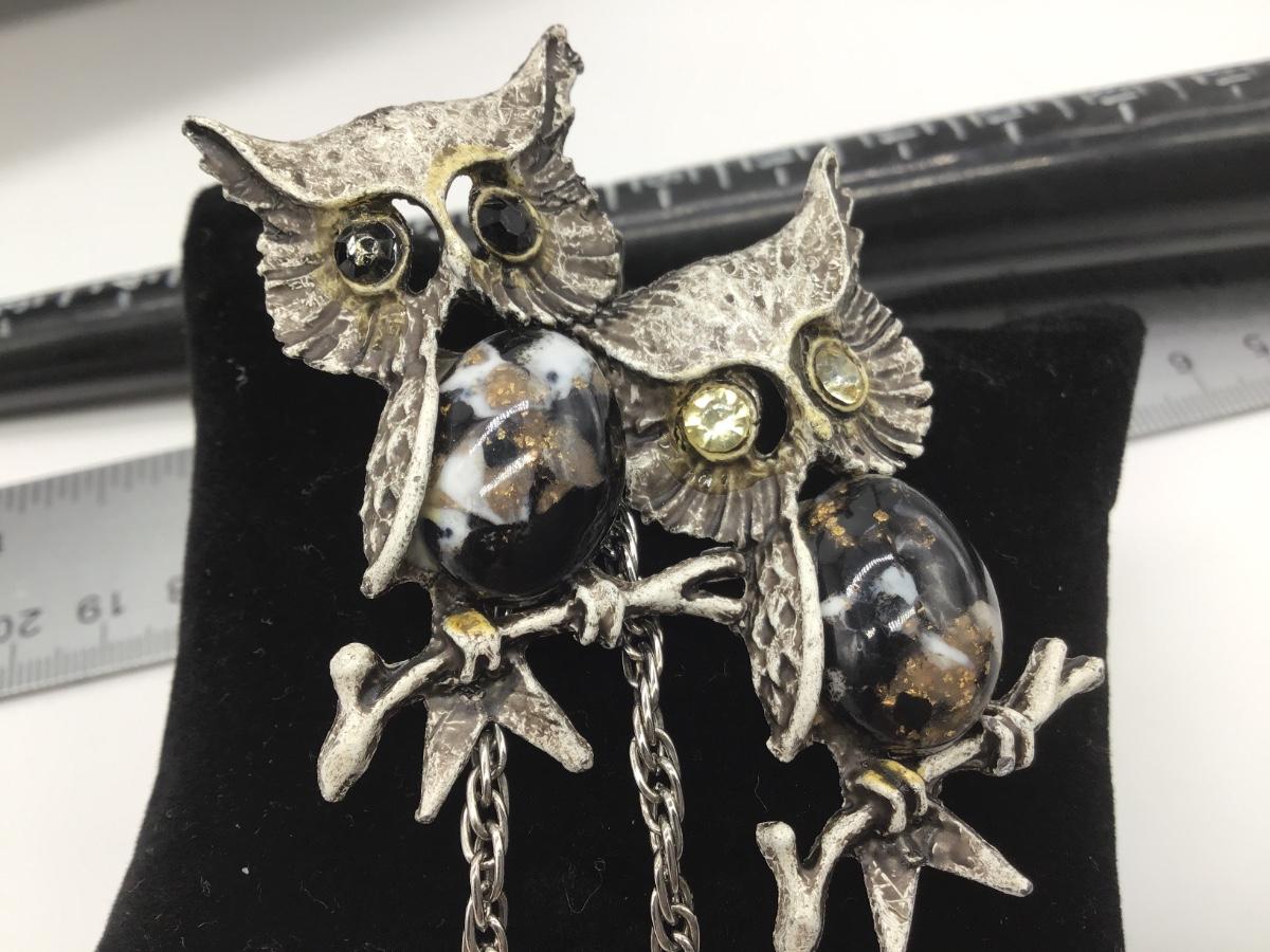 Vintage Pendant HMS Owl White Metal Lucite Bead Black Rhinestone Eyes