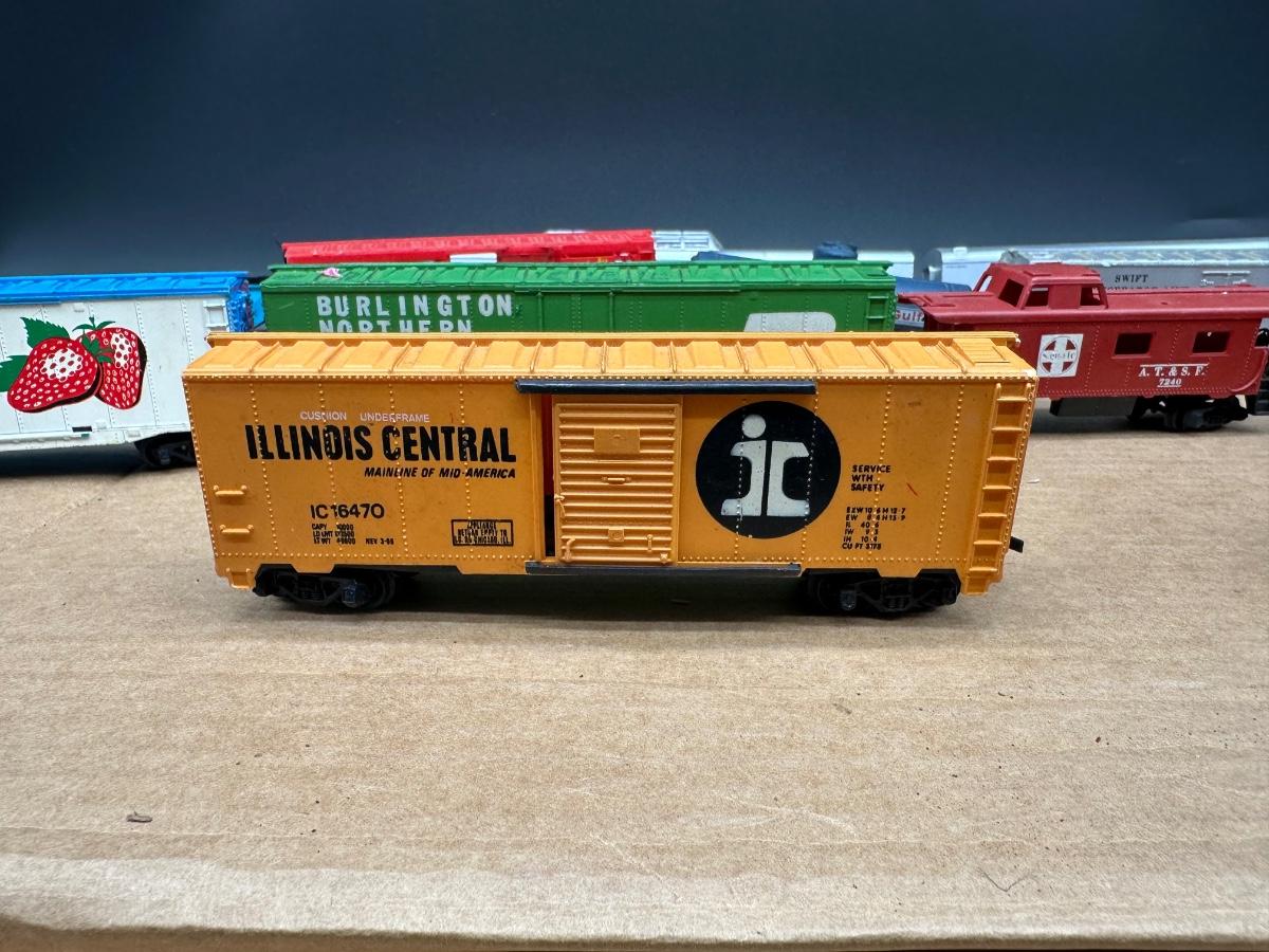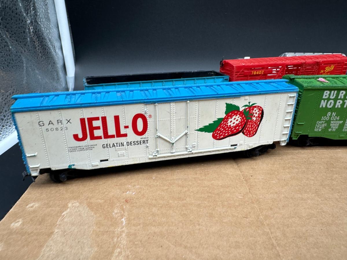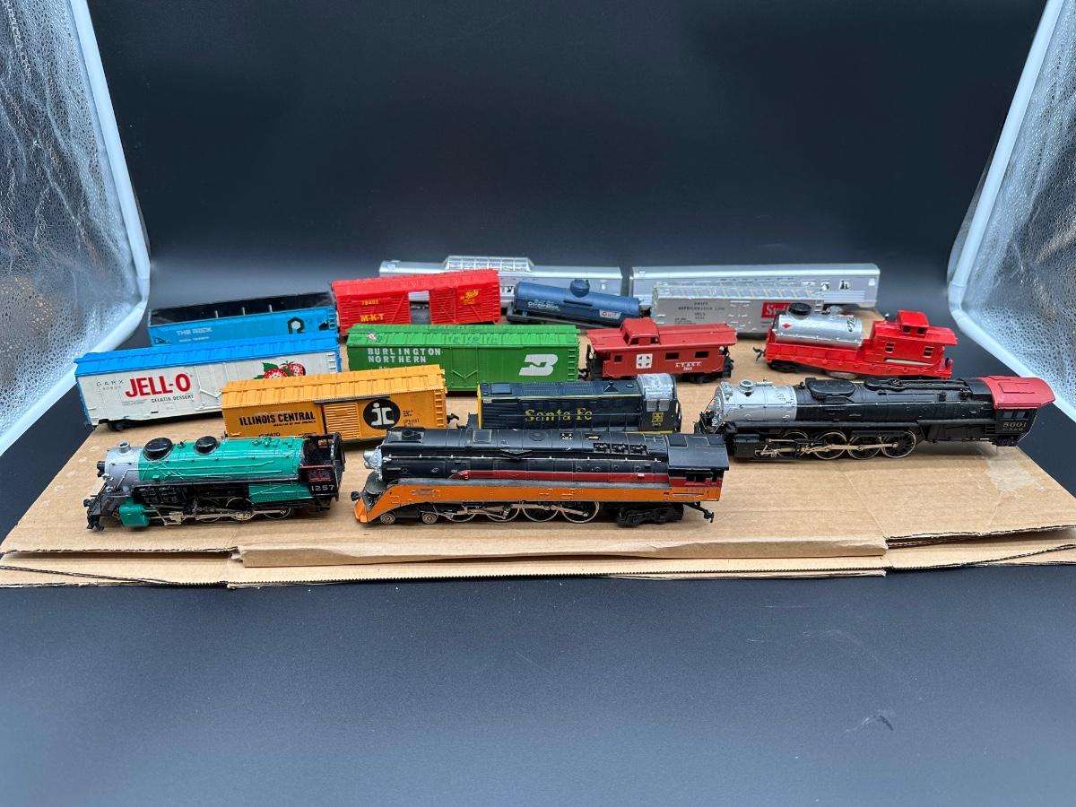 Mixed HO scale model train collection including multiple locomotives (steam & diesel), assorted freight cars (boxcars, tank cars, caboose, specialty cars), curved/straight track, bridges, accessories, and an HO power pack/transformer. Brands and road names visible include Santa Fe, Burlington Northern, Illinois Central, Jell-O, and others.