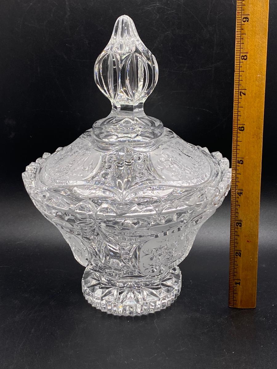 Rare vintage Hofbauer dragon design lidded candy dish. Heavy thick crystal dish. Frosted panels with an imprinted dragon in the center. Good condition, no chips noticed. Stands about 9" tall.