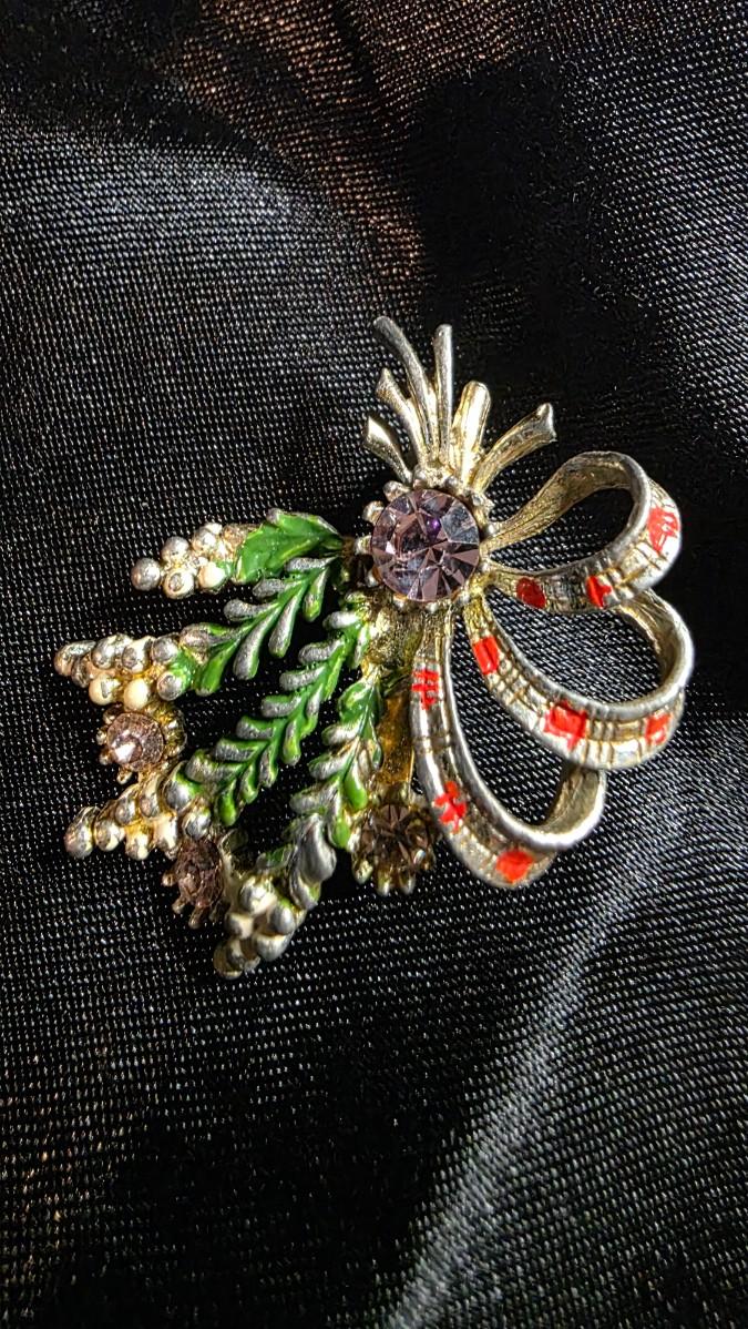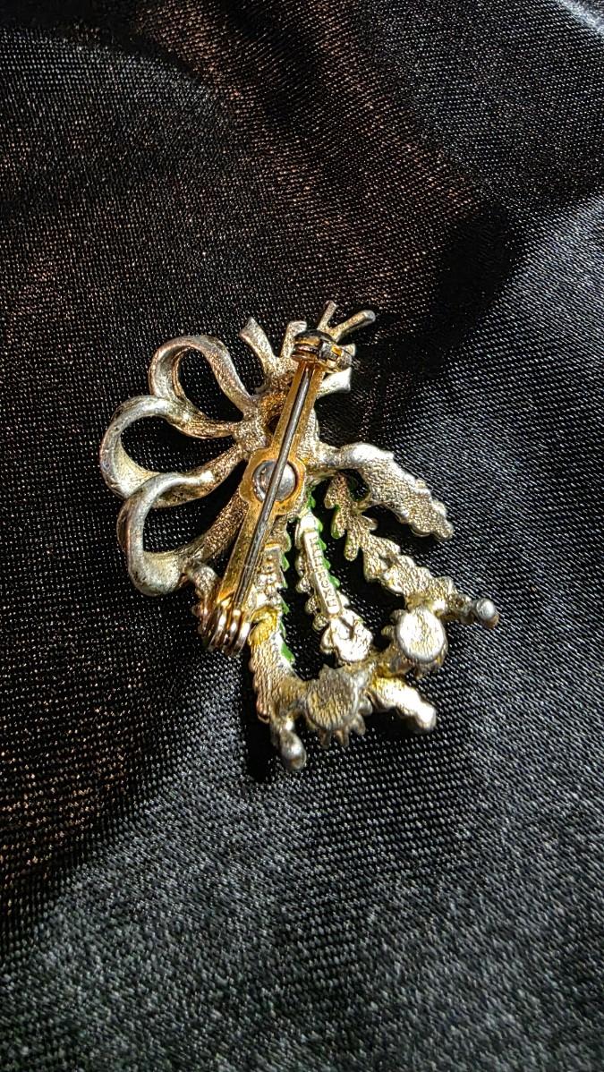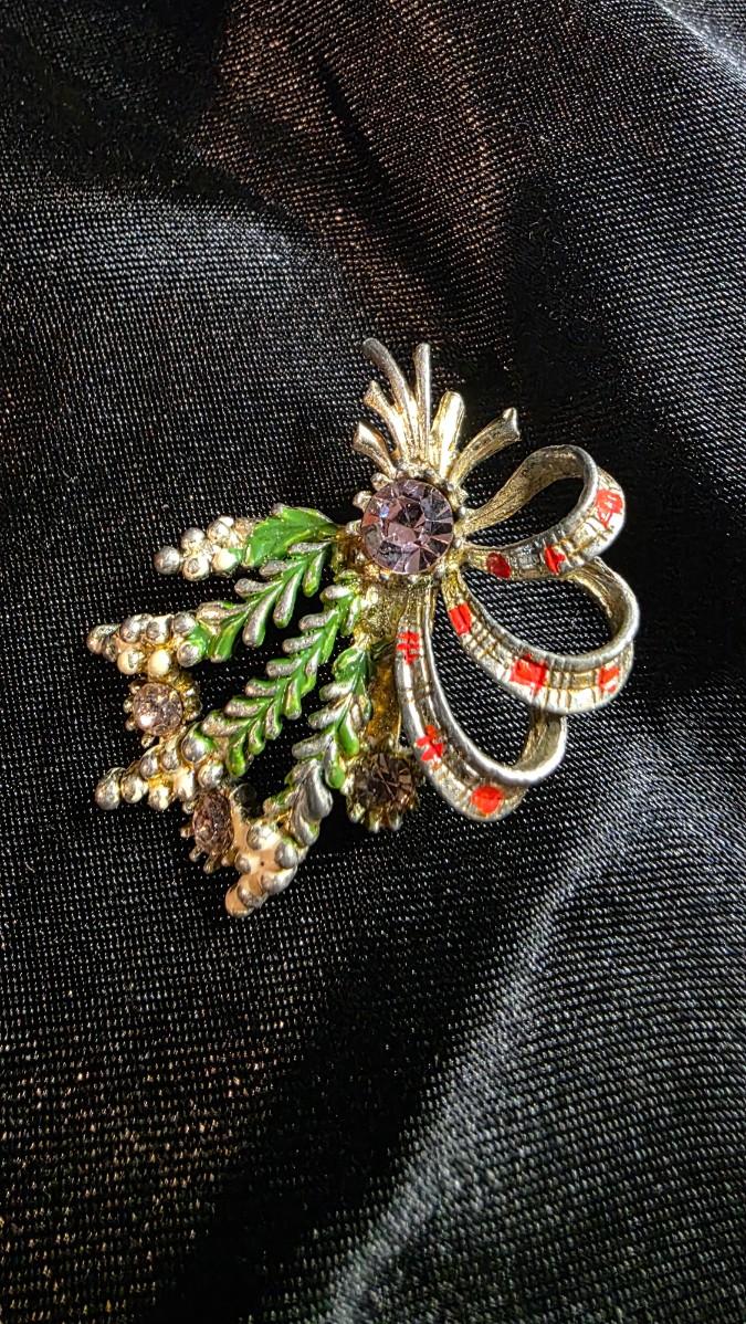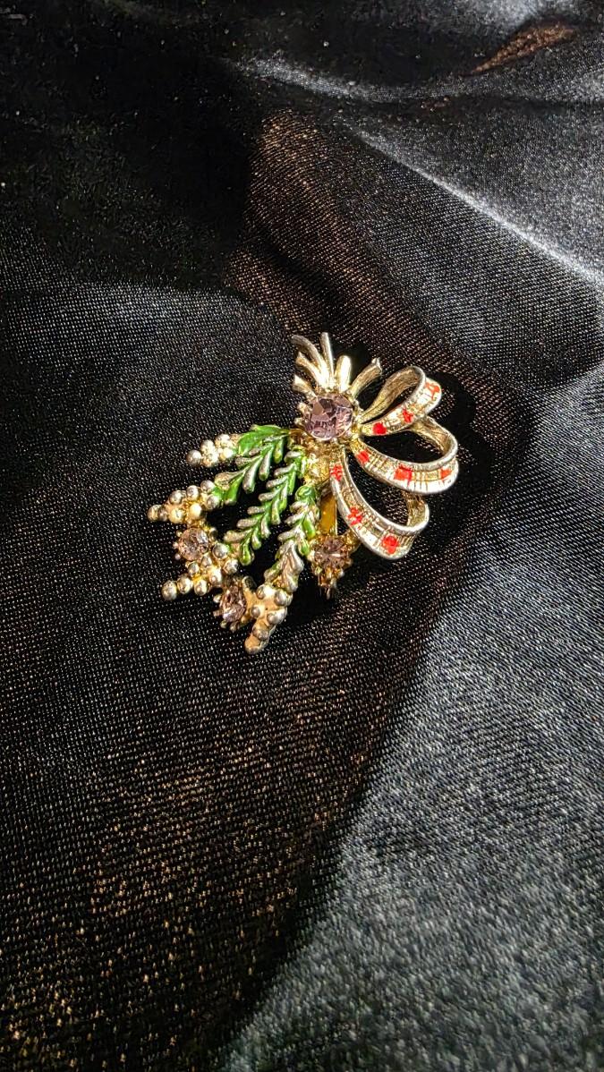 Vintage Holiday Bow & Evergreen Spray Rhinestone Pin Brooch – Festive Enamel Accents